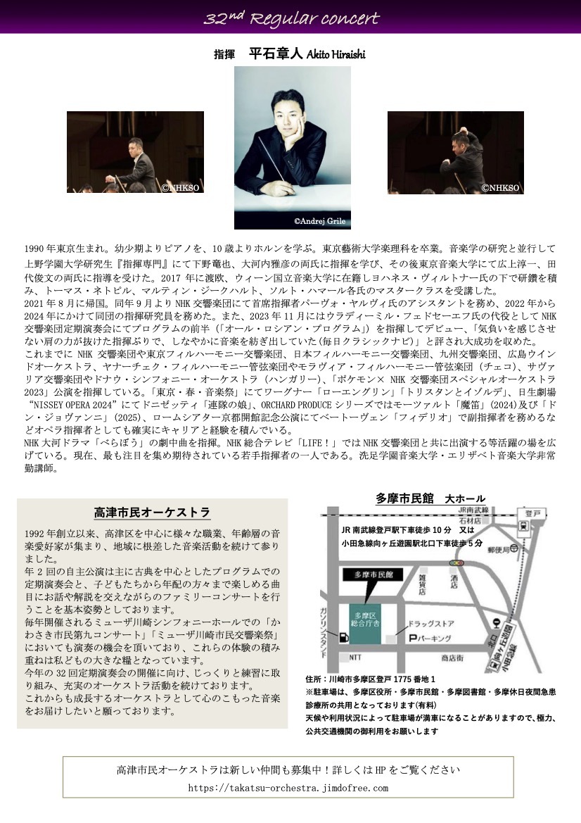 1992 年創立以来、高津区を中心に様々な職業や年齢層の音楽愛好家が集まり、地域に根差した音楽活動を続けております。