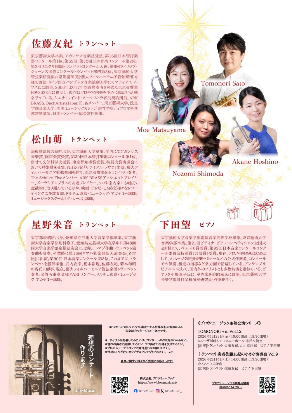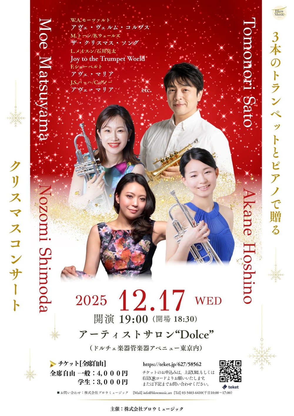 クリスマスソングやクリスマスにまつわるクラシックの名曲を、日本を代表する 3 人のトランペット奏者が様々な種類のトランペットの仲間を使って贈る、色彩感満載なクリスマスコ ンサート🎄