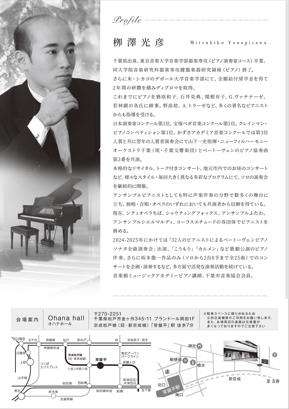 千葉県の京成松戸線「常盤平」駅から徒歩7分に位置するオハナホールは、スタインウェイピアノB-211を備え、豊かな響きでクラシック演奏に適した知る人ぞ知る音楽ホールです。