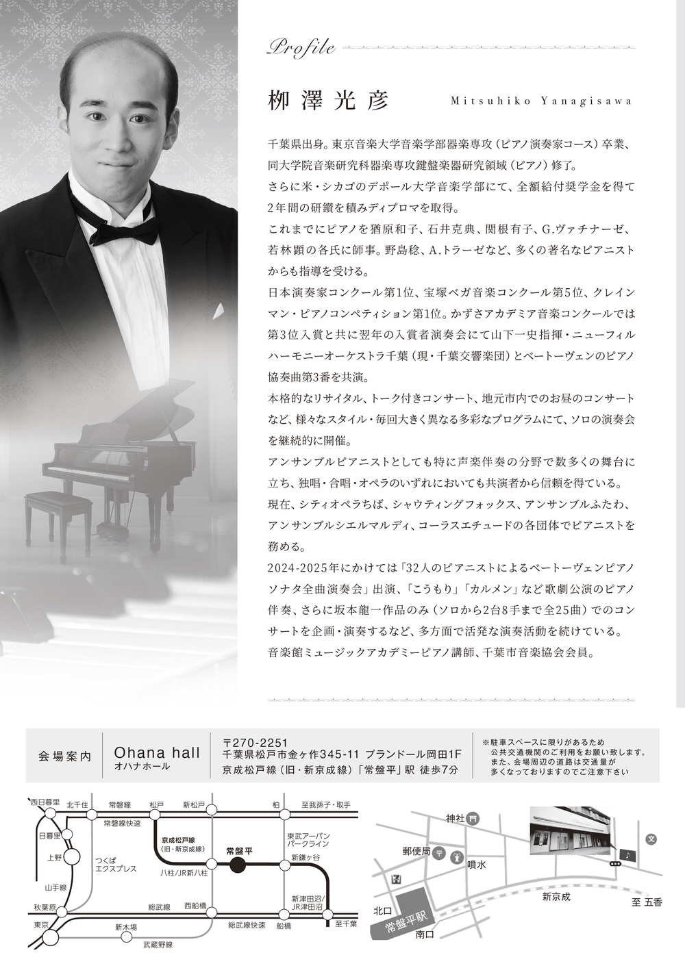 千葉県の京成松戸線「常盤平」駅から徒歩7分に位置するオハナホールは、スタインウェイピアノB-211を備え、豊かな響きでクラシック演奏に適した知る人ぞ知る音楽ホールです。