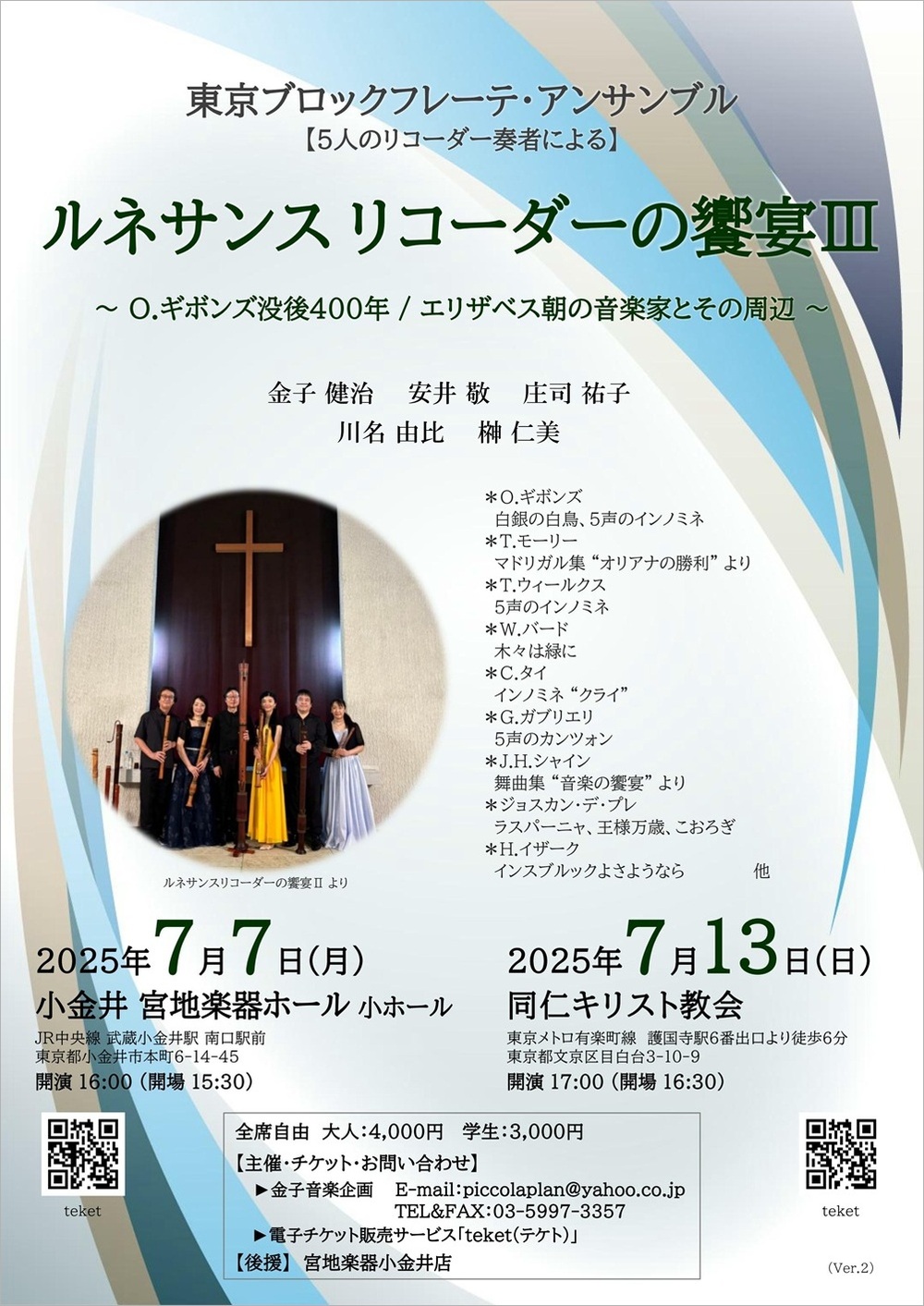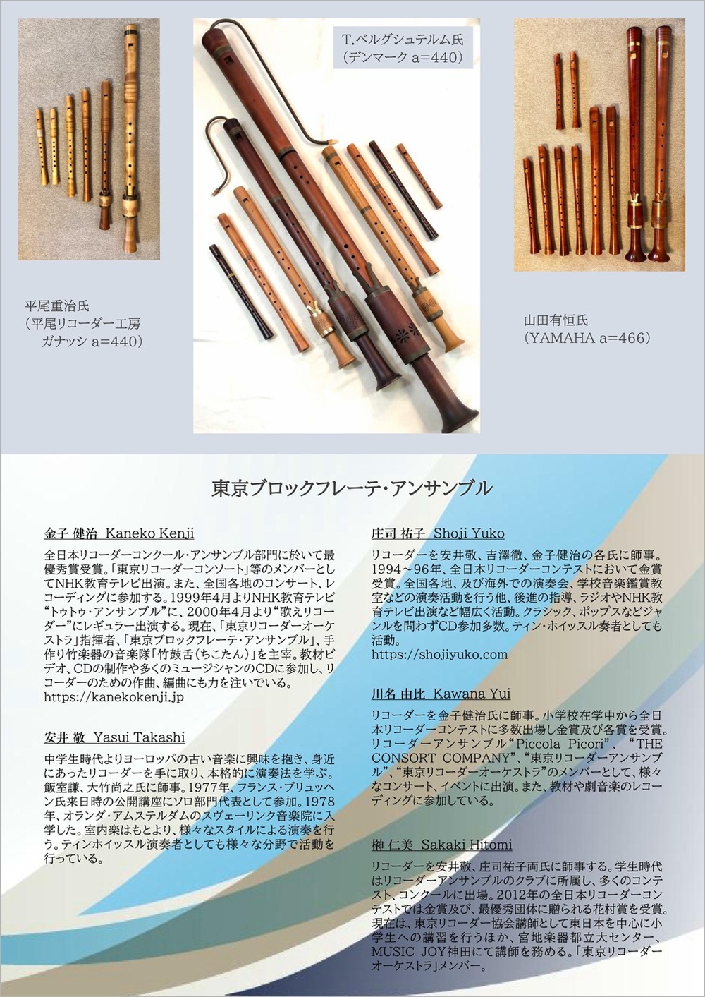 T.ベルグシュテルム氏(デンマーク a=440)、平尾重治氏(平尾リコーダー工房 ガナッシ a=440)、山田有恒氏(YAMAHA a=466)ら3名の製作家によるルネサンスリコーダーセットでお送りいたします。礼拝堂に広がる重厚で豊かな響きをお楽しみください。