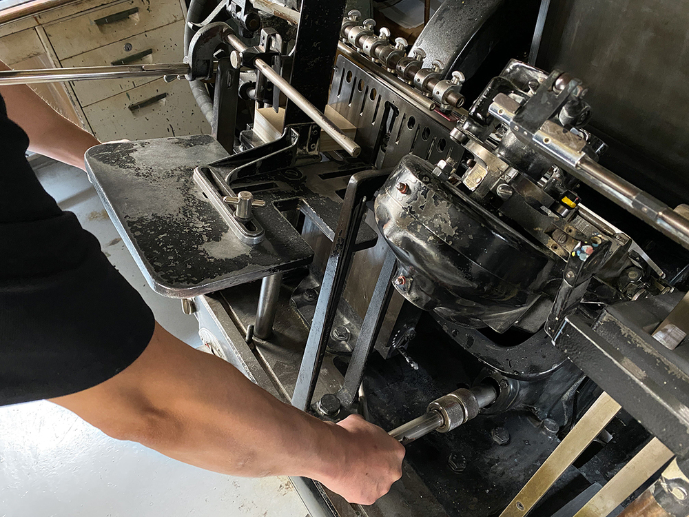 印刷工が実際に機械を動かしながら、活版の仕組みや特徴を丁寧に解説します。