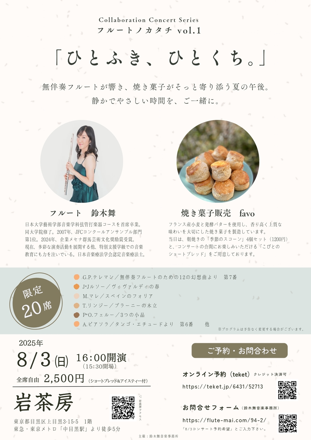 無伴奏フルートが響き、焼き菓子がそっと寄り添う夏の午後。静かでやさしい時間を、ご一緒に。