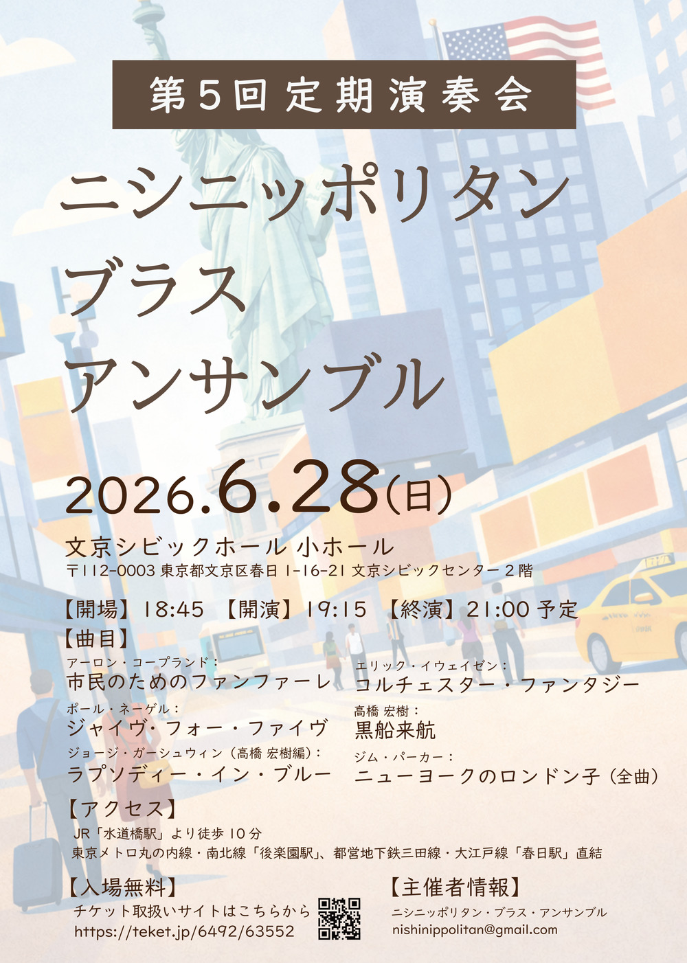 西日暮里方面の金管、打楽器奏者が集まり結成されたニシニッポリタン・ブラス・アンサンブル。今回はアメリカを題材に、金管アンサンブルの名曲達を演奏します。