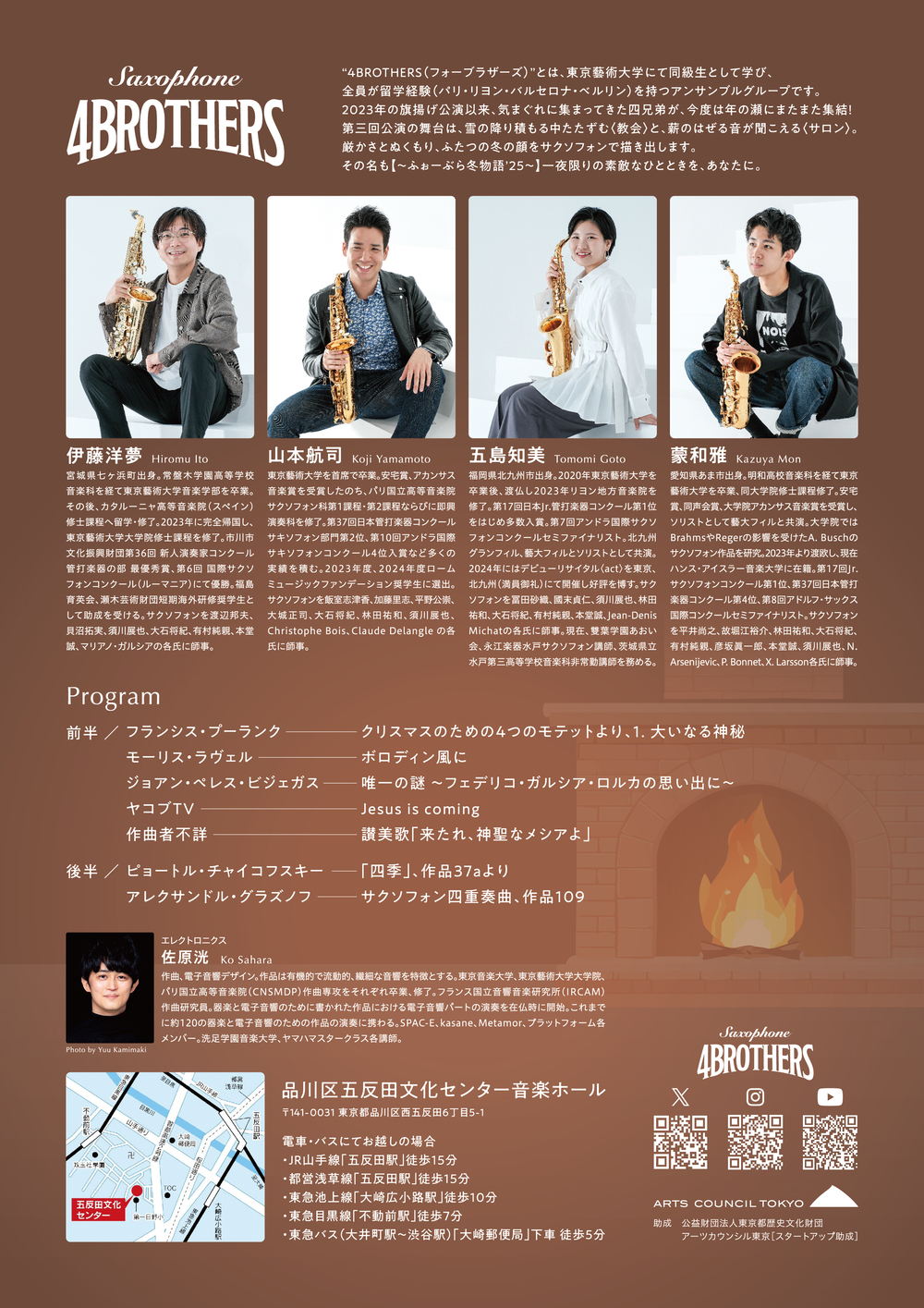 4BROTHERS (フォーブラザーズ)”とは、東京藝術大学にて同級生として学び、全員が留学経験(パリ・リヨン・バルセロナ・ベルリン)を持つアンサンブルグループです。
