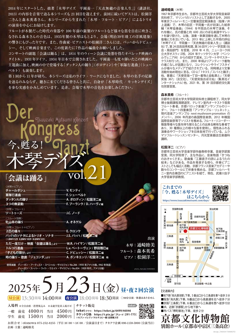 2014 年にスタートした、拙著『木琴デイズ 平岡養一「天衣無縫の音楽人生」』(講談社、2013)の内容を音楽で辿る本シリーズも 21 回目を迎えます。前回に続いてゲストは、松園洋二さんと森本英希さん。本シリーズから生まれた「木琴・フルート・ピアノ」によるトリオの演奏を中心にお届けします。