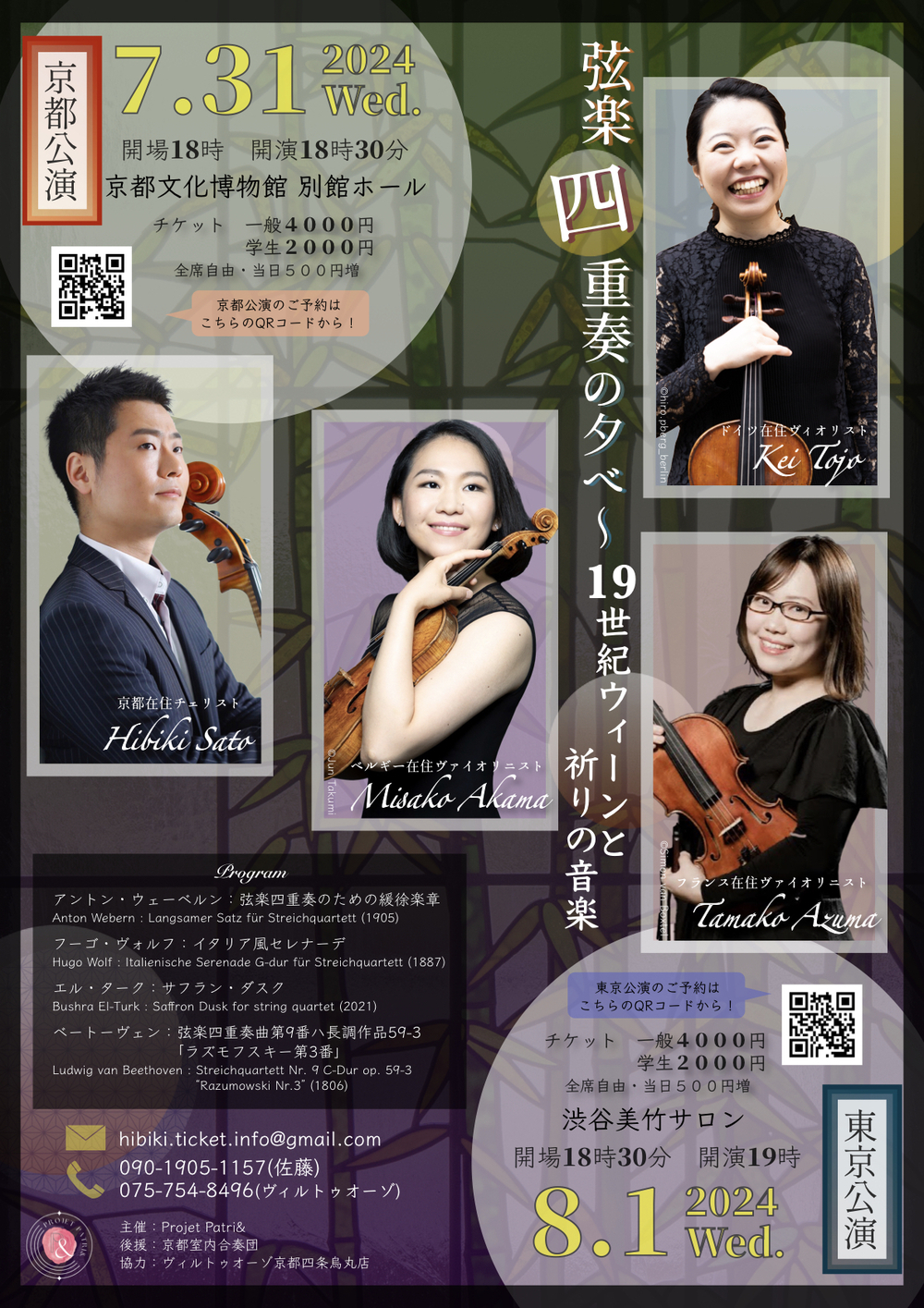 海外の名門オーケストラの首席を務める若手実力派が、今年も京都に集結!去年は初共演でリゲティの難曲に挑み好評を博しましたが、今年はベートーヴェンの絶頂期の傑作ラズモフスキーより第3番をメインに、日本であまり弾かれることのない不思議な魅力を持つ楽曲の数々をお届け致します。