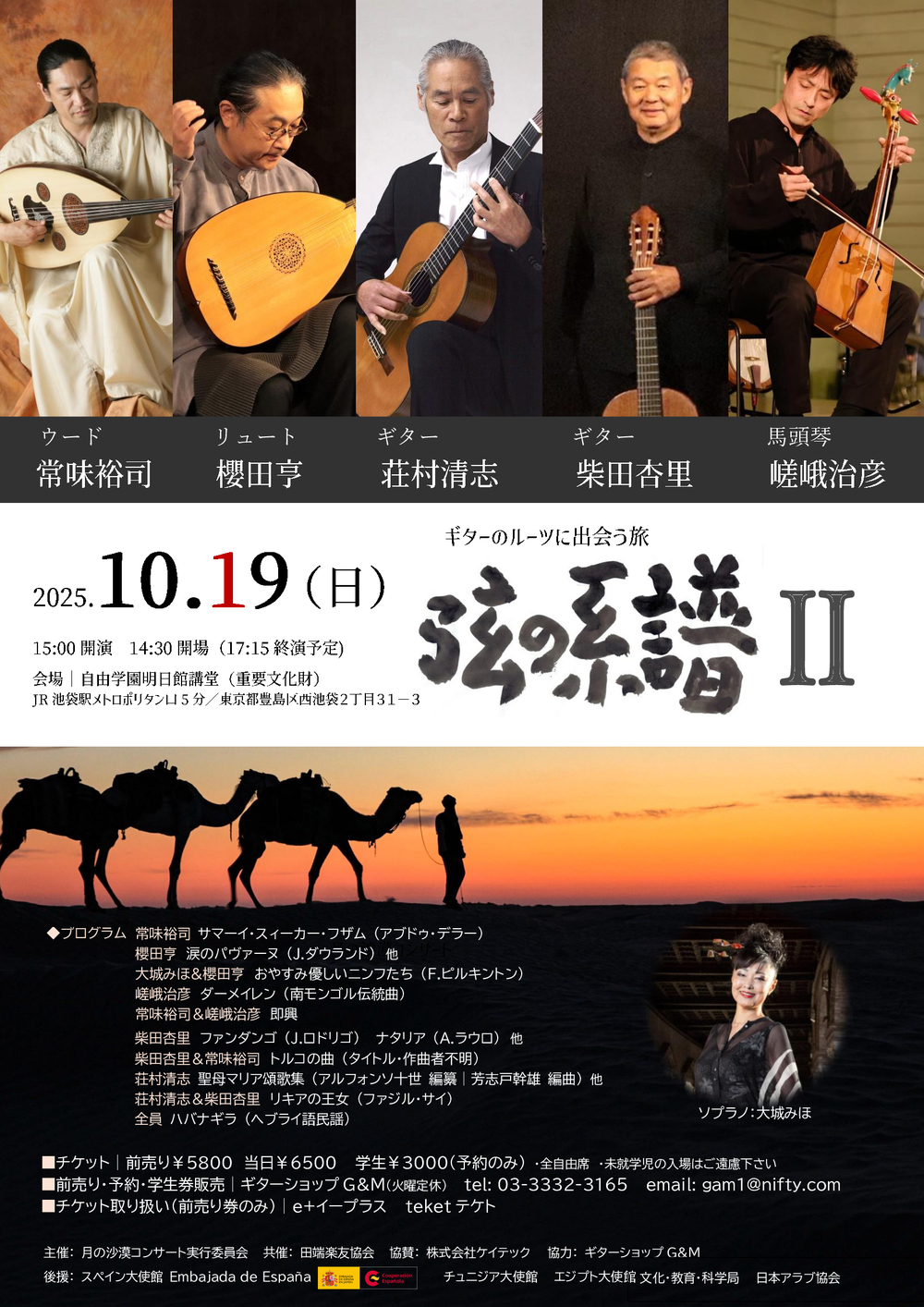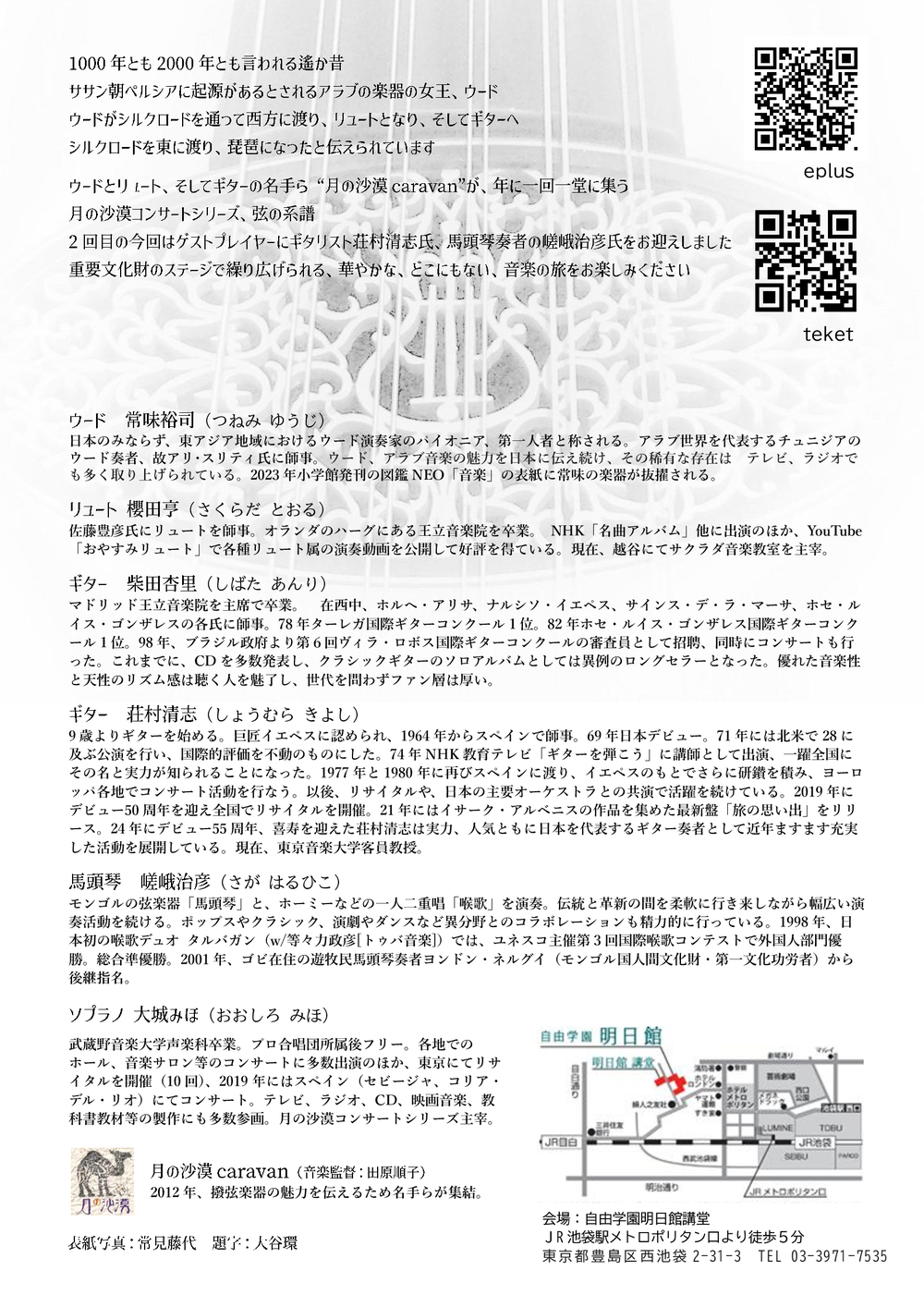 月の沙漠コンサートシリーズ「弦の系譜」は、国の重要文化財のステージに、ウードとリュート、そしてギターの名手らが一堂に集い、