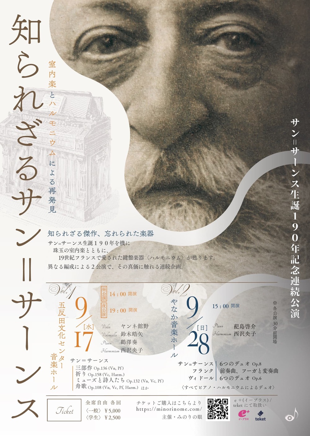 ピアノとハルモニウムという希少なデュオ編成で、若き日のサン=サーンスが遺した《6つのデュオ Op.8》を全曲演奏。さらに、同時代の作曲家フランクとヴィドールによる、静謐で豊かな響きの佳品も紹介。忘れられた楽器ハルモニウムの魅力を、現代に蘇らせる貴重な機会です。