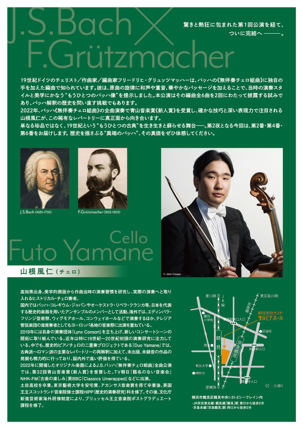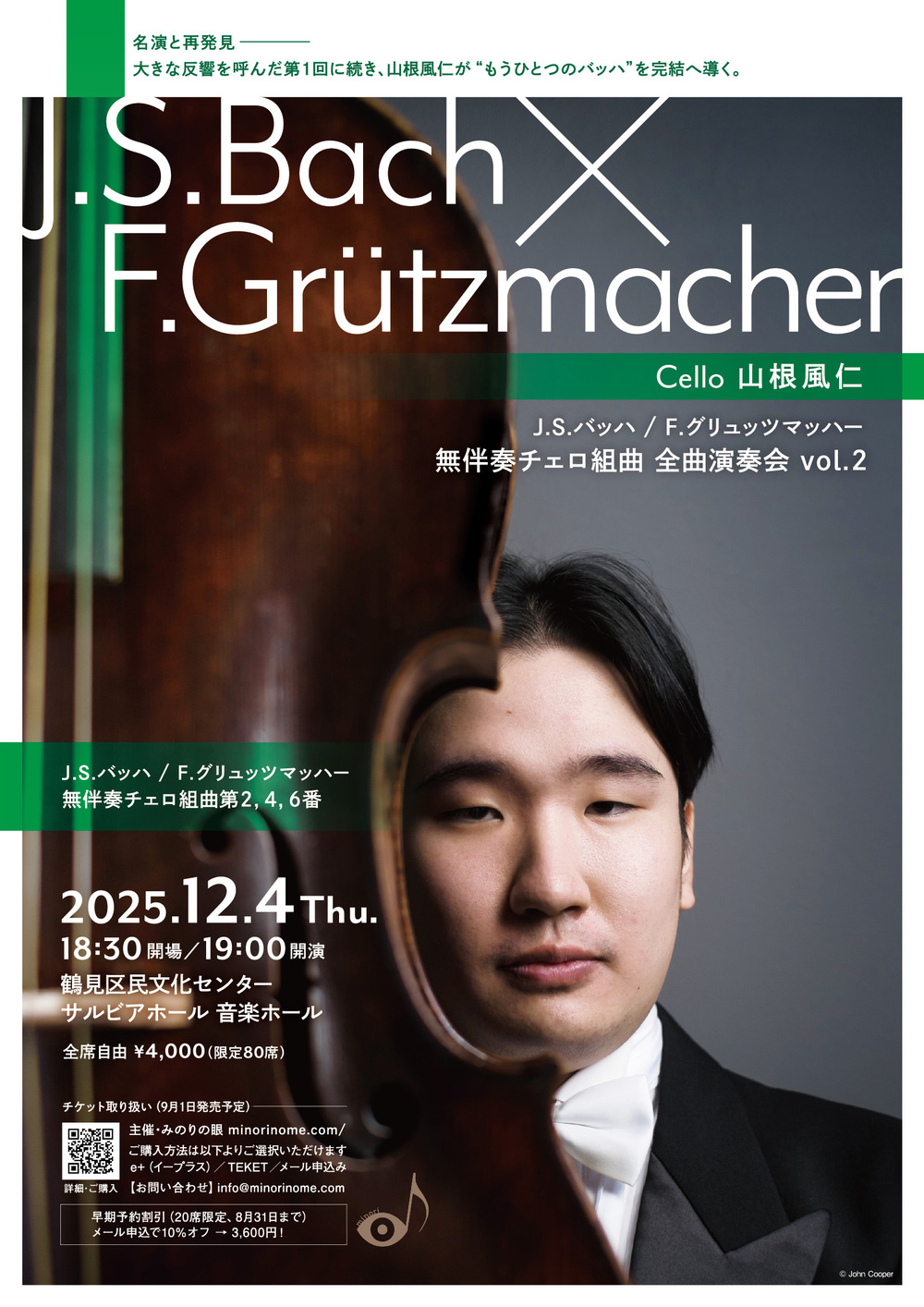 2022年、バッハ《無伴奏チェロ組曲》の全曲演奏で青山音楽賞《新人賞》を受賞し、確かな技巧と深い表現力で注目される山根風仁が、この稀有なレパートリーに真正面から向き合います。
