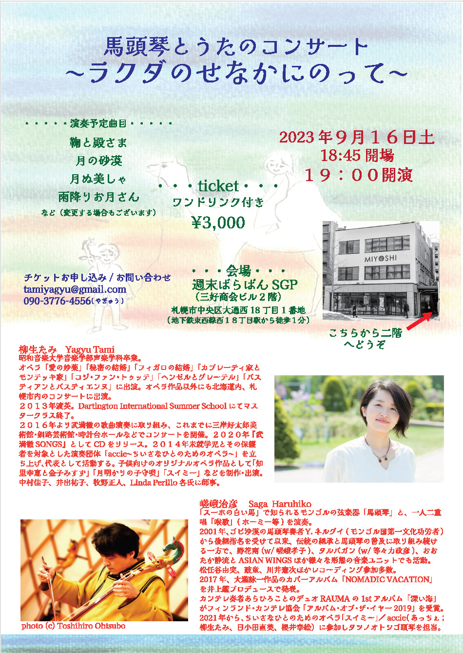大正時代のにほんの歌、モンゴルの歌、ゴビ砂漠の不思議な風習を描いた『ラクダの涙』の朗読など、馬頭琴と歌で繰り広げられる音楽の世界を美味しいワインと共にお楽しみください。
