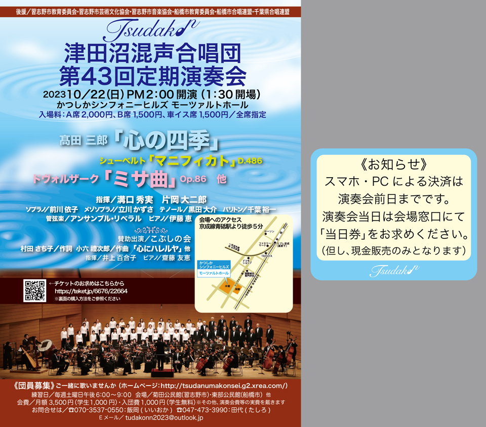 津田沼混声合唱団は1977年創立のアマチュア混声合唱団です。管弦楽付きの大曲から、ピアノ伴奏やアカペラの合唱曲まで幅広く取り組んでおります。 今年はかつしかシンフォニーヒルズにおいて、髙田三郎 混声合唱組曲『心の四季』(ピアノ伴奏)、およびシューベルトとドヴォルザークの宗教曲(管弦楽版)を取り組みます。どうぞお楽しみください。