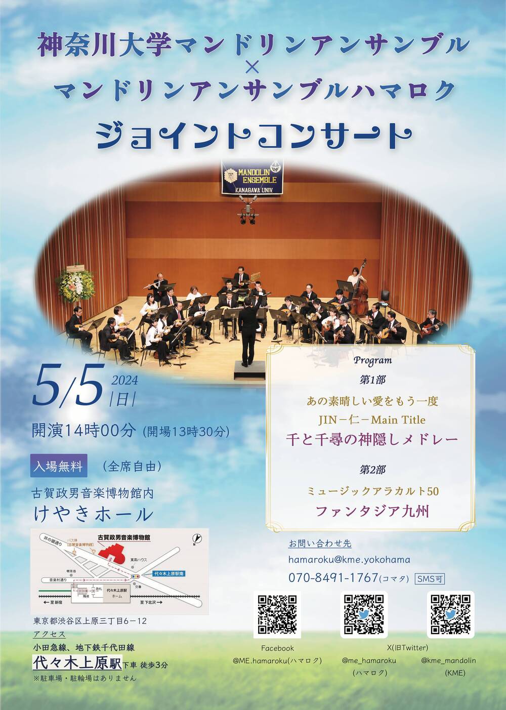 今年で創部52年(2019年現在)を迎える伝統のクラブ、神奈川大学マンドリンアンサンブル(通称:KME)のOB・OGによって2019年に結成されました。 楽団名「ハマロク」は神奈川大学の地元である「横浜六角橋」に由来します。 地元横浜の学生さんからご年配の方まで、マンドリンを知らない方にも演奏を聴いていただき、マンドリンアンサンブルの楽しさや魅力を広めていきたいという目的で、地域に根差した活動をしていく団体です。 ※マンドリンアンサンブルとは? マンドリン、クラシックギター、コントラバス、打楽器、管楽器などによるオーケストラで、クラシックやマンドリンのオリジナル曲から、映画音楽、アニメ音楽、歌謡曲、演歌まで色々なシーンに合わせて幅広いジャンルの曲を演奏しています。 マンドリン独特のトレモロ、優美で可憐で繊細で愛らしい、ときには哀愁漂う音色をお楽しみください。
