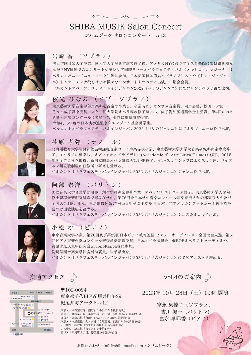 ソプラノ/岩崎香、メゾソプラノ/依光ひなの、テノール/荏原孝弥、バリトン/阿部泰洋、ピアノ/小松桃