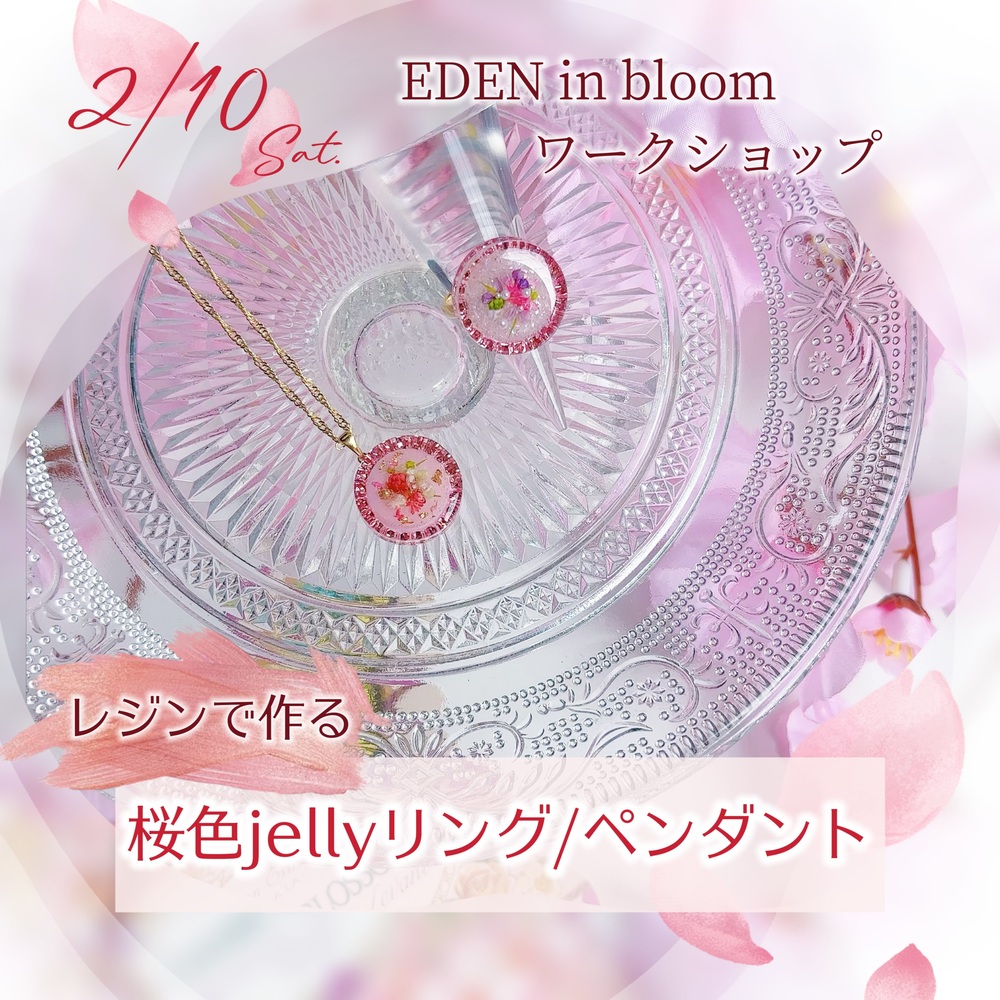 EDEN in bloomオリジナルのきらきら輝く桜色クリスタルフレームの中に、桜チップやラメをレジンに閉じ込めて、自分だけの桜色ゼリーをイメージしたアクセサリーを作ります。