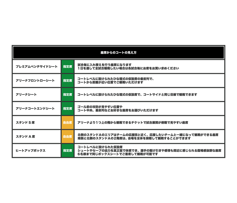 ・〖プレミアムベンチサイドシート〗のチケットは試合毎の入替制になります。対象試合の試合観戦以外はスタンドA席で試合観戦することができます。