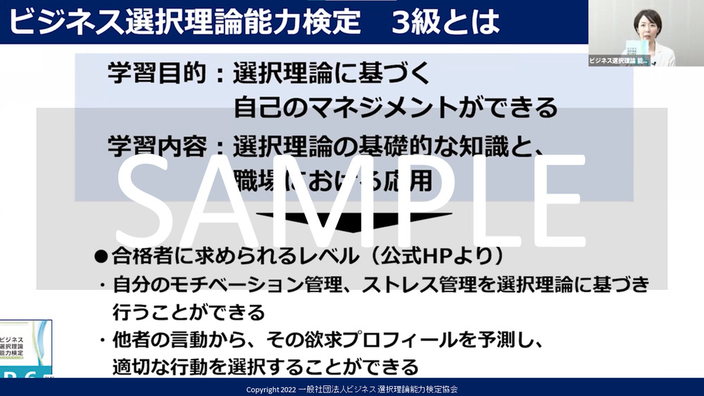 ※過去に開催された「ビジネス選択理論能力検定 対策講座3級」の録画映像になります。あらかじめご了承ください。