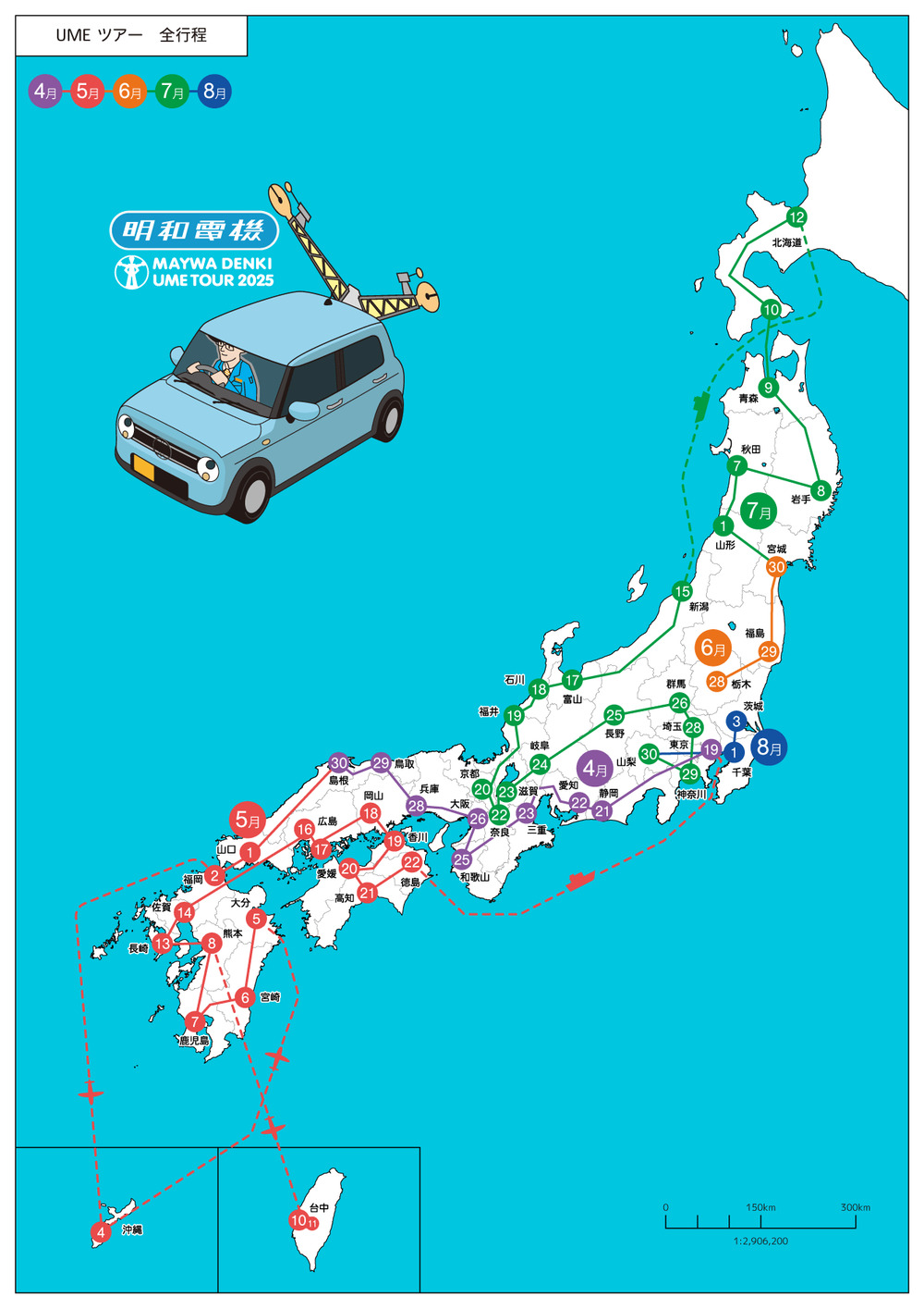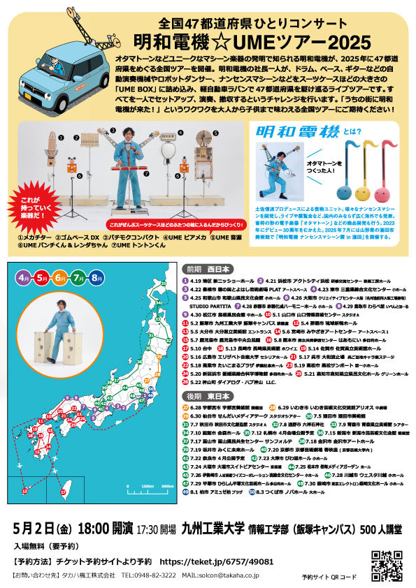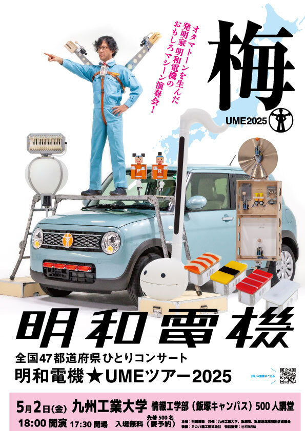オタマトーンなどユニークなマシーン楽器の発明で知られる明和電機が、2025年に前代未聞の47都道府県をめぐる全国ツアーをスタートします。明和電機の社長たった一人が、ドラム、ベース、ギターなどの自動演奏機械やロボットダンサー、ナンセンスマシーンをスーツケースほどの大きさの「UMEBOX」に詰め込み、軽自動車ラパンで47都道府県を駆け巡るライブツアーです。すべてを一人でセットアップ、演奏、撤収するというチャレンジを行います。飯塚市とタカハ機工(株)がタックを組んで若い世代にものづくりとプログラミングを学べる明和電機ライブを楽しんでもらいたいという気持ちで共催・後援しています!