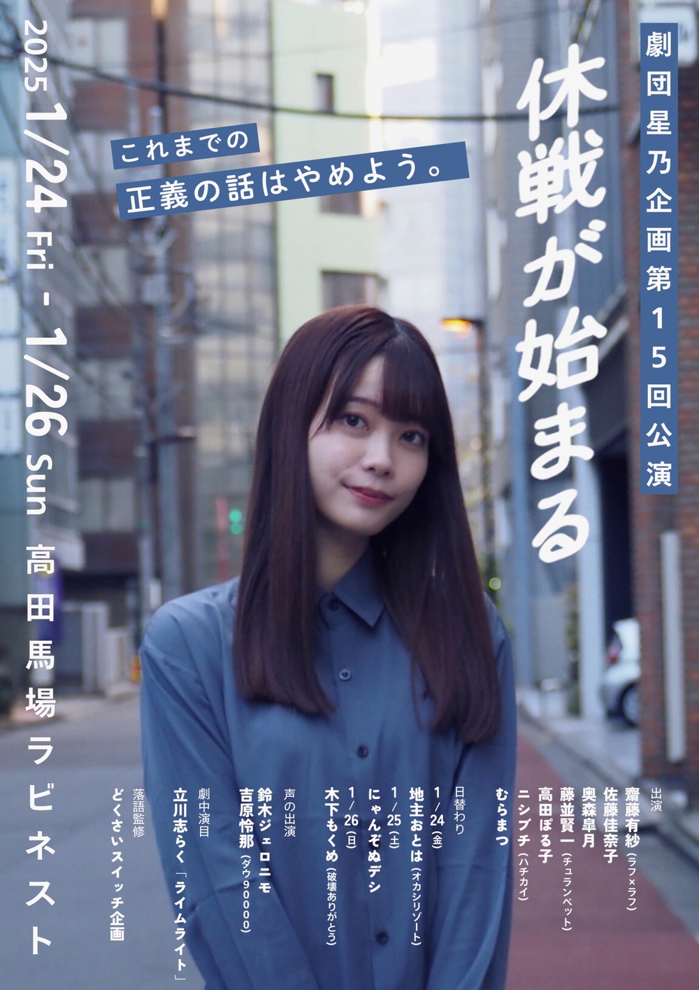 本ページでは、2025年1月24日(金)〜26日(日)に高田馬場ラビネストで上演した 劇団星乃企画第15回公演『休戦が始まる』のうち、25日(土)上演回のアーカイブ配信をご購入いただけます。