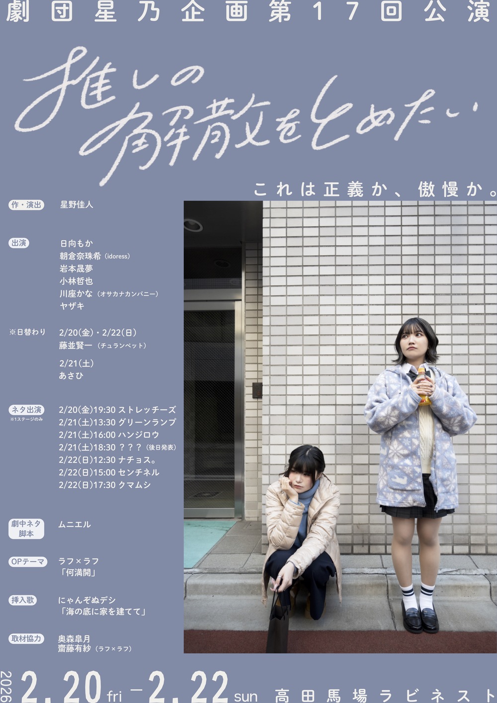 本ページでは、2026年2月20日(金)〜22日(日)に高田馬場ラビネストで上演した 劇団星乃企画第17回公演『推しの解散をとめたい』のうち、2月22日(日)17:30上演回のアーカイブ配信をご購入いただけます。