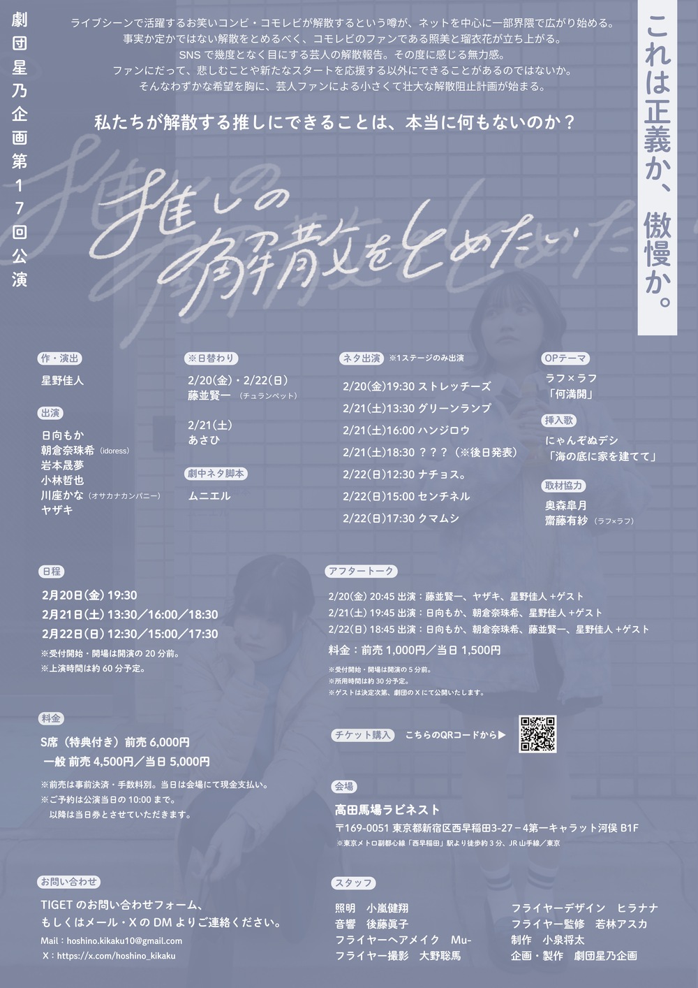 本ページでは、2026年2月20日(金)〜22日(日)に高田馬場ラビネストで上演した 劇団星乃企画第17回公演『推しの解散をとめたい』のうち、2月22日(日)17:30上演回のアーカイブ配信をご購入いただけます。