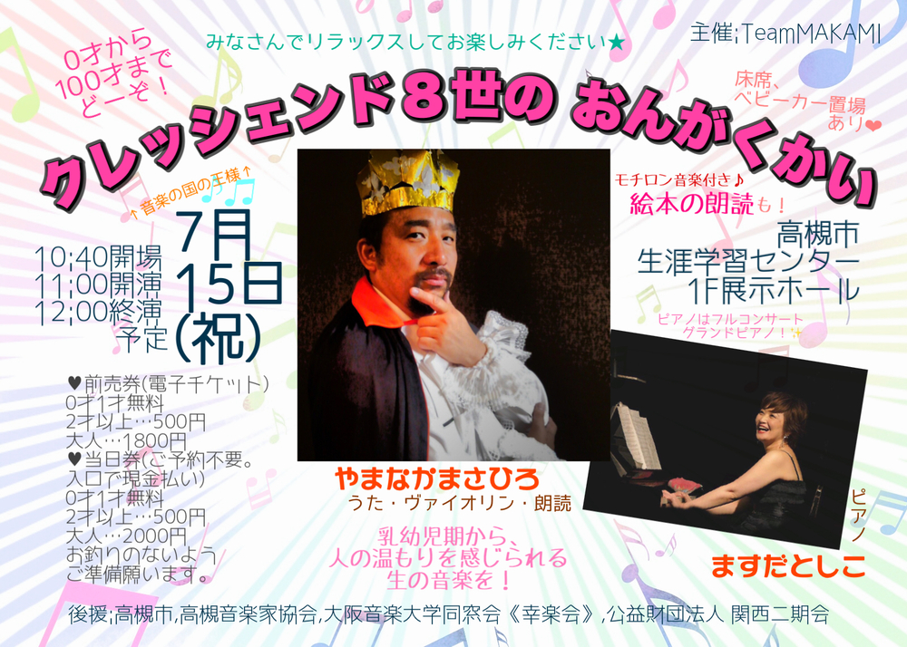 音楽の国からやってきた王様クレッシェンド8世(山中雅博)と、サベックスちゃん(増田敏子)が繰り広げる楽しい音楽会。うた、ヴァイオリン、ピアノ、音楽付き朗読もあり、盛りだくさん!曲目は、当日のお楽しみです♪