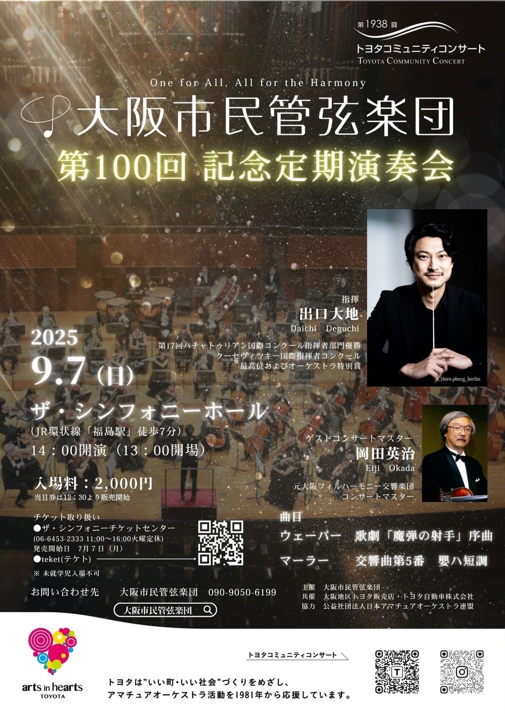 今回、指揮者に「題名のない音楽会」でもお馴染みの出口大地先生を、ゲストコンサートマスターに当団トレーナーで元大阪フィルハーモニー交響楽団コンサートマスターの岡田英治先生をお招きし、盛大に記念演奏会を開催する運びとなりました。