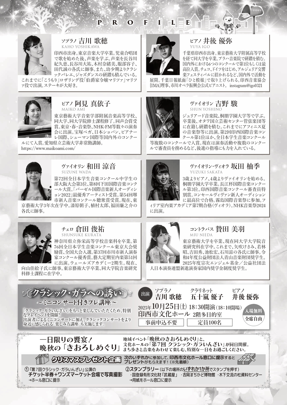 アーティストによる楽しいお話とともに、クラシック音楽の魅力をお届けします。フィナーレは、一足早いクリスマス気分を味わえる華やかなメドレーをお楽しみに!