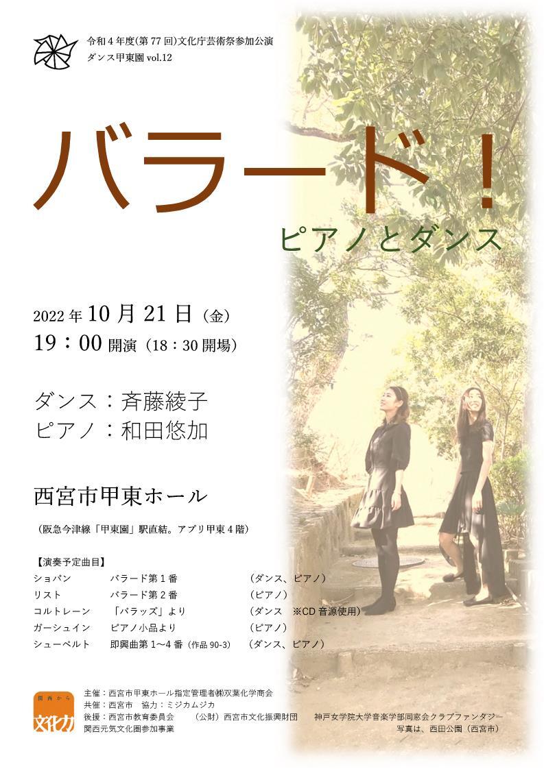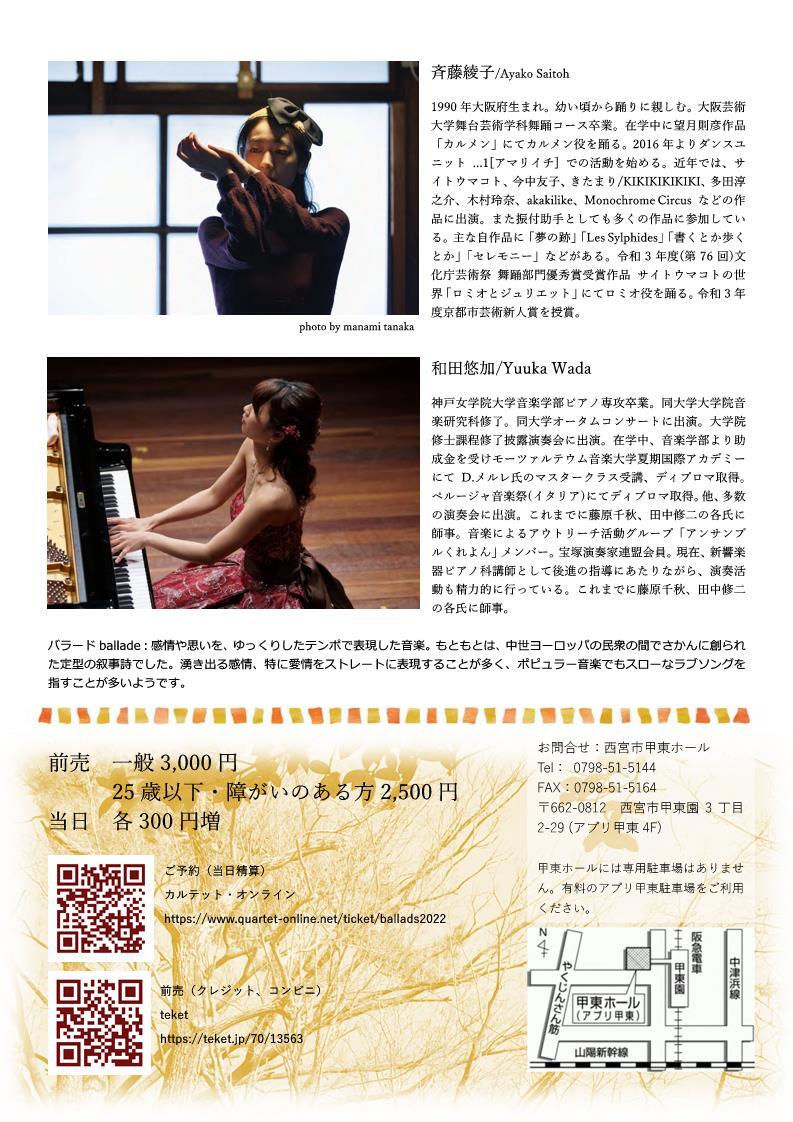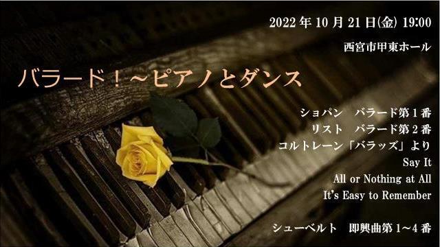 ショパンの「バラード」を中心に、ジャズにおけるバラードの名曲としてジョン・コルトレーンの名盤から、そしてジャズ=クラシックの代表的な作曲家であるガーシュイン、そしてバラード的なゆるやかな抒情の美しいシューベルトを並べるプログラム。名曲をコンテンポラリーダンスとピアノで楽しむひととき。