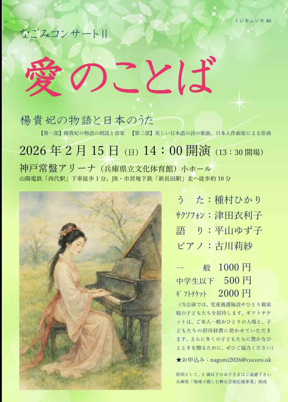 第二部 愛のことば 物語、言葉、メロディ、音色、声の魅力を味わいましょう。演奏予定曲目:献呈(シューマン)、今日もひとつ(なかにしあかね)、めぐり逢い(武満徹)ほか