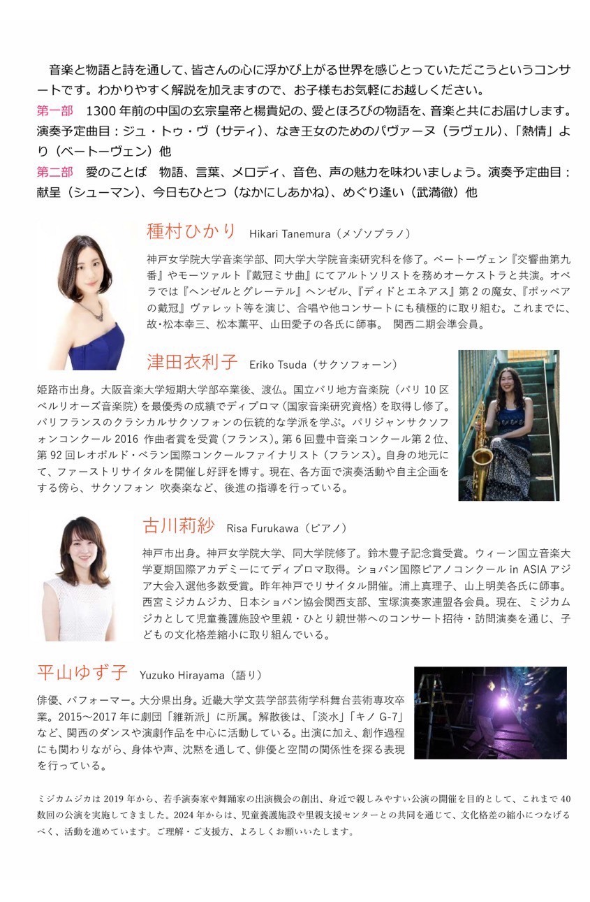 第一部 1300年前の中国の玄宗皇帝と楊貴妃の、愛と滅びの物語を、音楽と共にお届けします。演奏予定曲目:ジュ・トゥ・ヴ(サティ)、なき王女のためのパヴァーヌ(ラヴェル)、「熱情」より(ベートーヴェン)ほか
