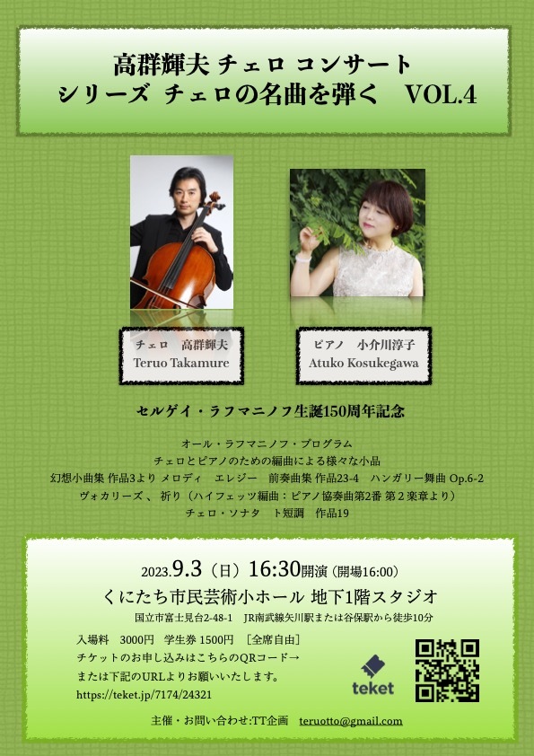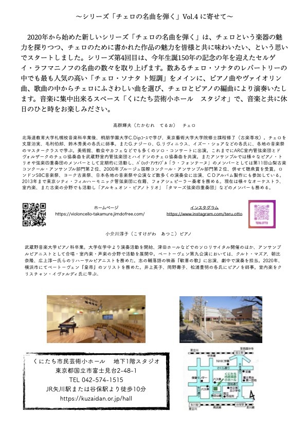 2020年から始めた新しいシリーズ「チェロの名曲を弾く」は、チェロという楽器の魅力を探りつつ、チェロのために書かれた作品の魅力を皆様と共に味わいたいという思いからスタートしました。2023年のシリーズ第4回は、今年生誕150年の記念の年を迎えたセルゲイ・ラフマニノフの名曲の数々を取り上げます。数あるチェロ・ソナタのレパートリーの中でも最も人気の高い「チェロ・ソナタ ト短調」をメインに、ピアノ曲やヴァイオリン曲、歌曲の中からチェロにふさわしい曲を選び、チェロとピアノの編曲により演奏いたします。音楽に集中出来るスペース「くにたち芸術小ホール スタジオ」で音楽と共に休日のひと時をお楽しみださい。