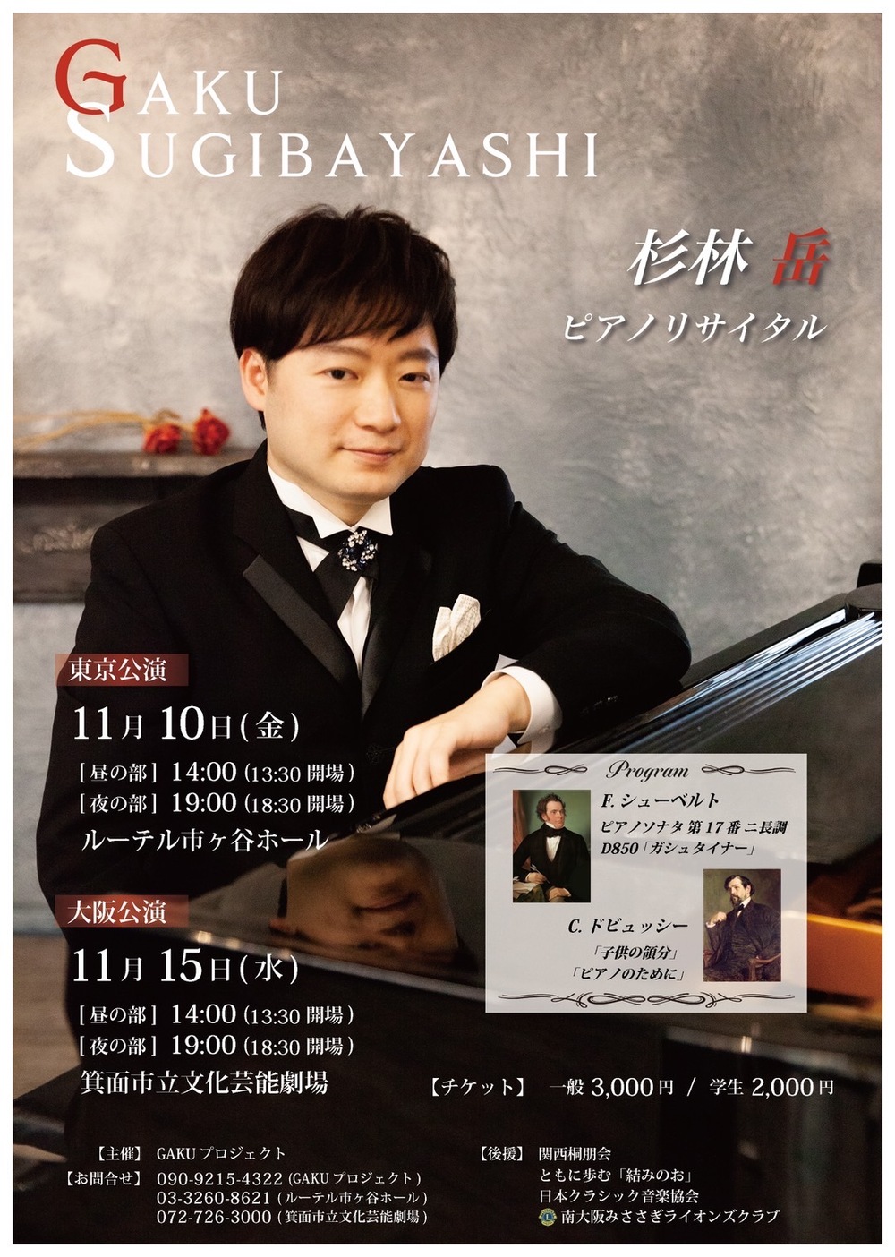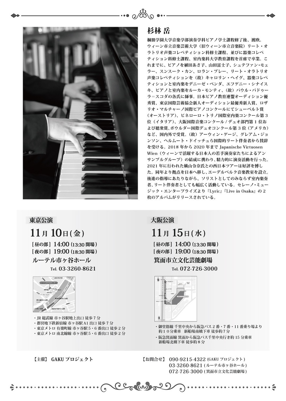 ウィーンで長年研鑽を積み活動した杉林岳が、ライフワークとするシューベルトの楽曲、『ガシュタイナー』と、またタイプは違う作曲家ではあるが、彼の得意とするドビュッシーの有名どころ楽曲をぜひご堪能ください。