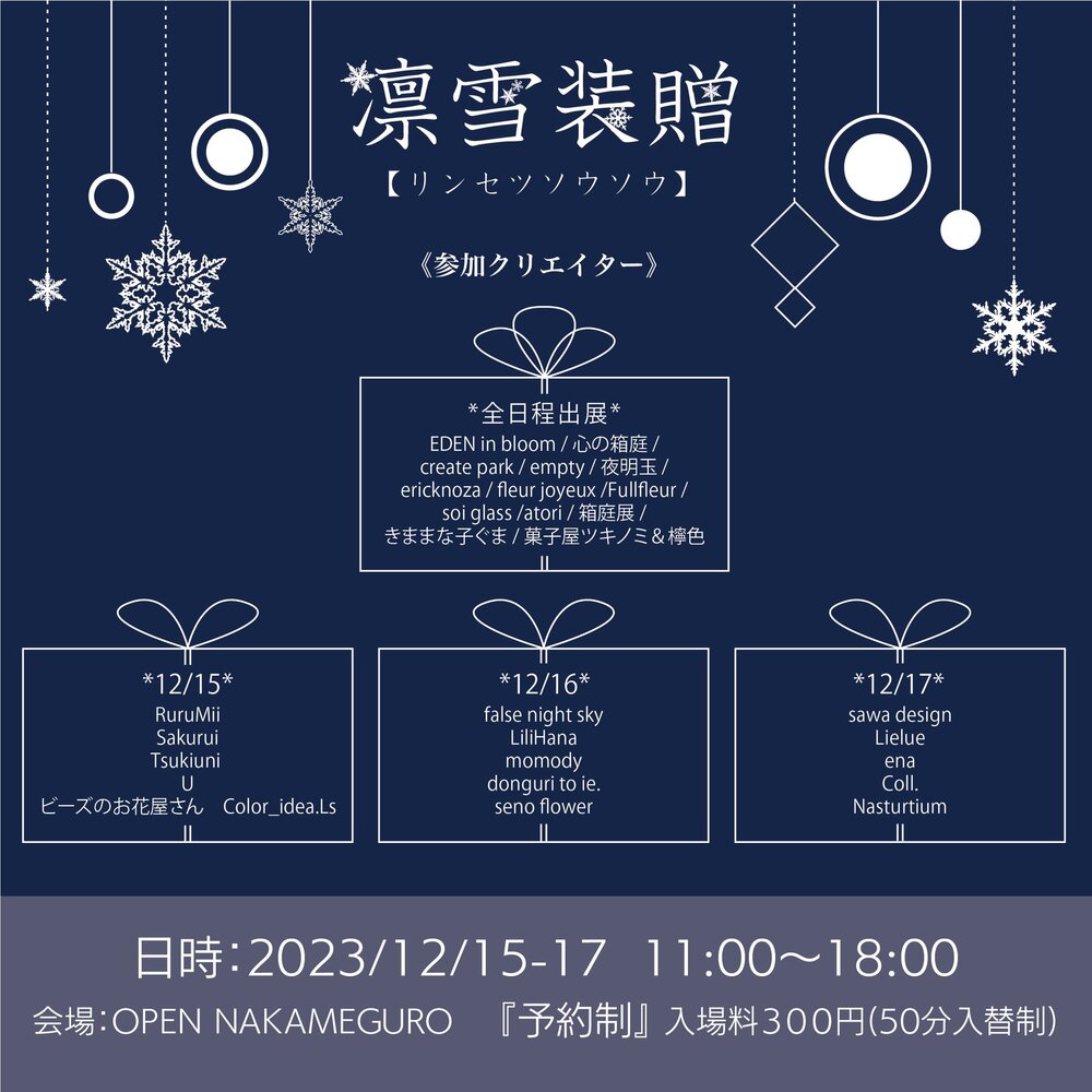 「冬の贈り物」をテーマに、全日程出展作家13組、日替わり出展作家15組、合計28組の作家による対面販売イベントを開催いたします。