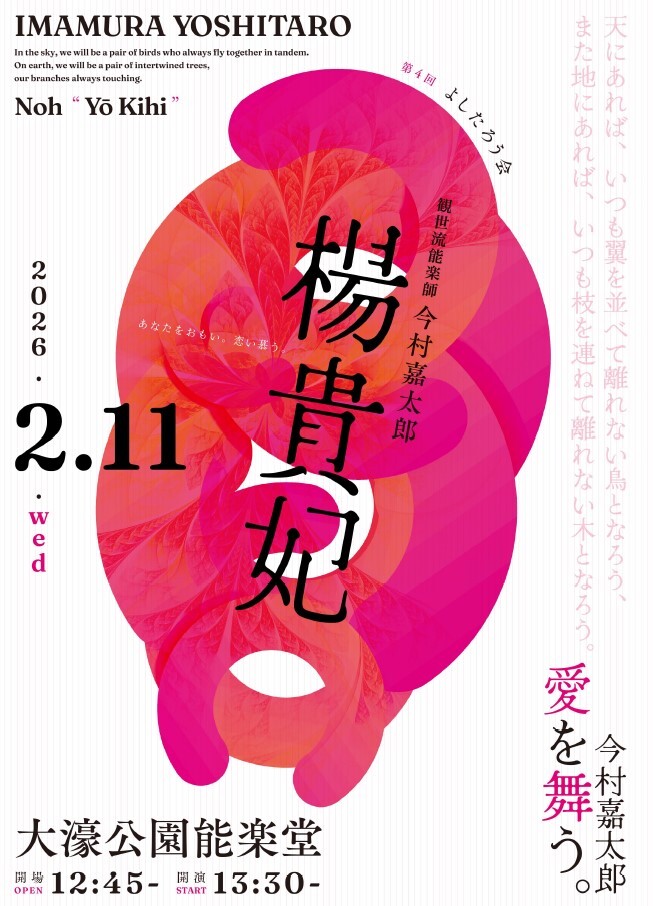 唐代随一の美女として語り継がれる誰もが知る存在を、能が得意とする夢幻の手法で描き出します。