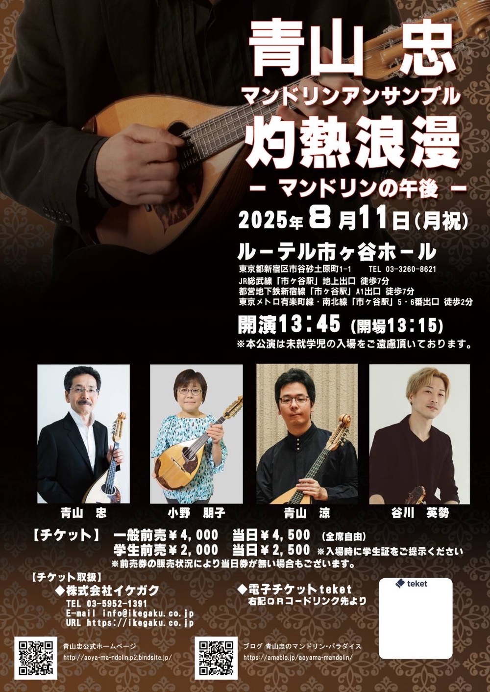 ジャンルにとらわれない幅広い活動を展開するマンドリンの第一人者である青山忠を中心に、全国で活動を行うマンドリンアンサンブル。コンサートでは、マンドリンの音色を生…