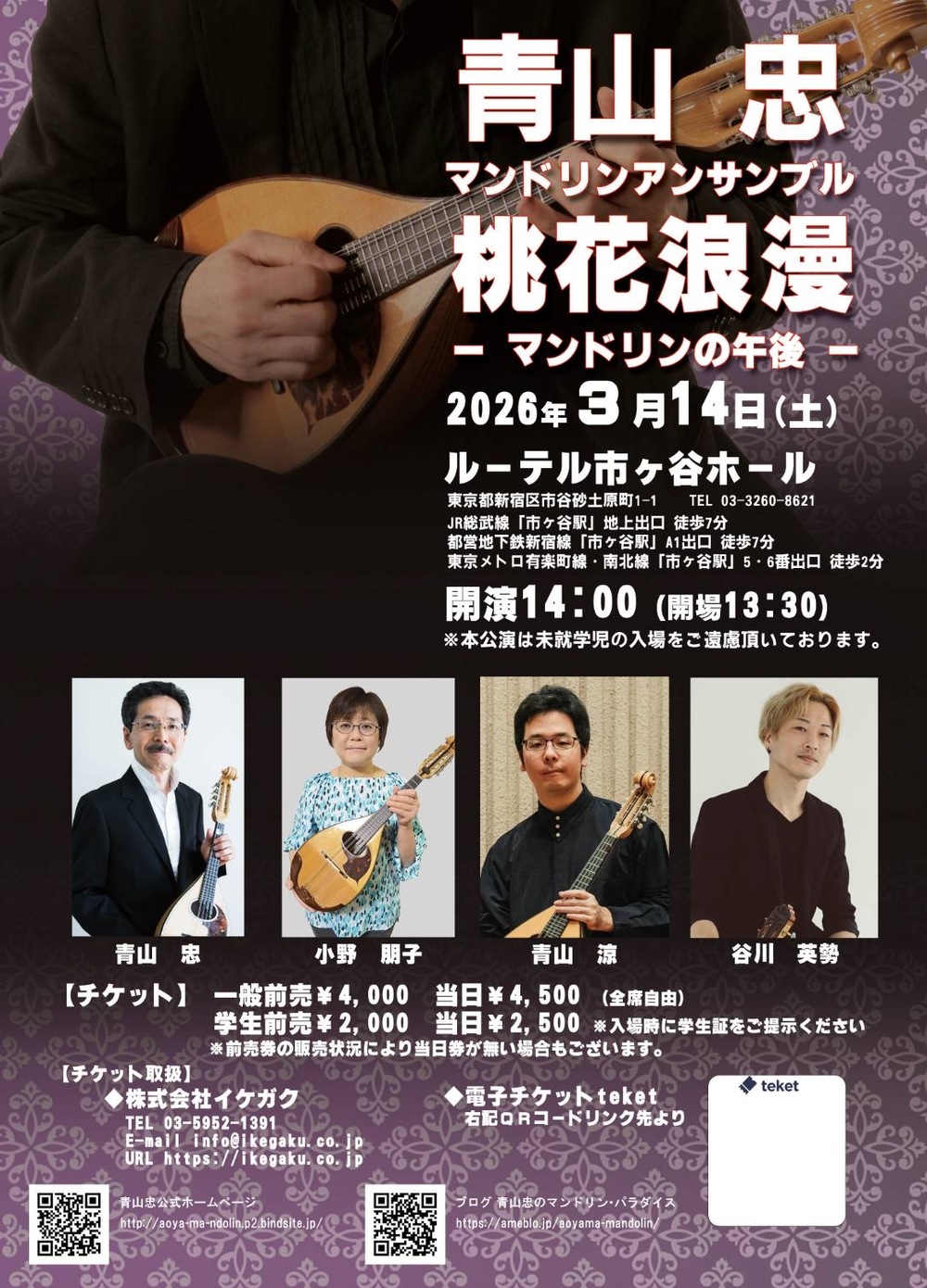 ジャンルにとらわれない幅広い活動を展開するマンドリンの第一人者である青山忠を中心に、全国で活動を行うマンドリンアンサンブル。コンサートでは、マンドリンの音色を生…