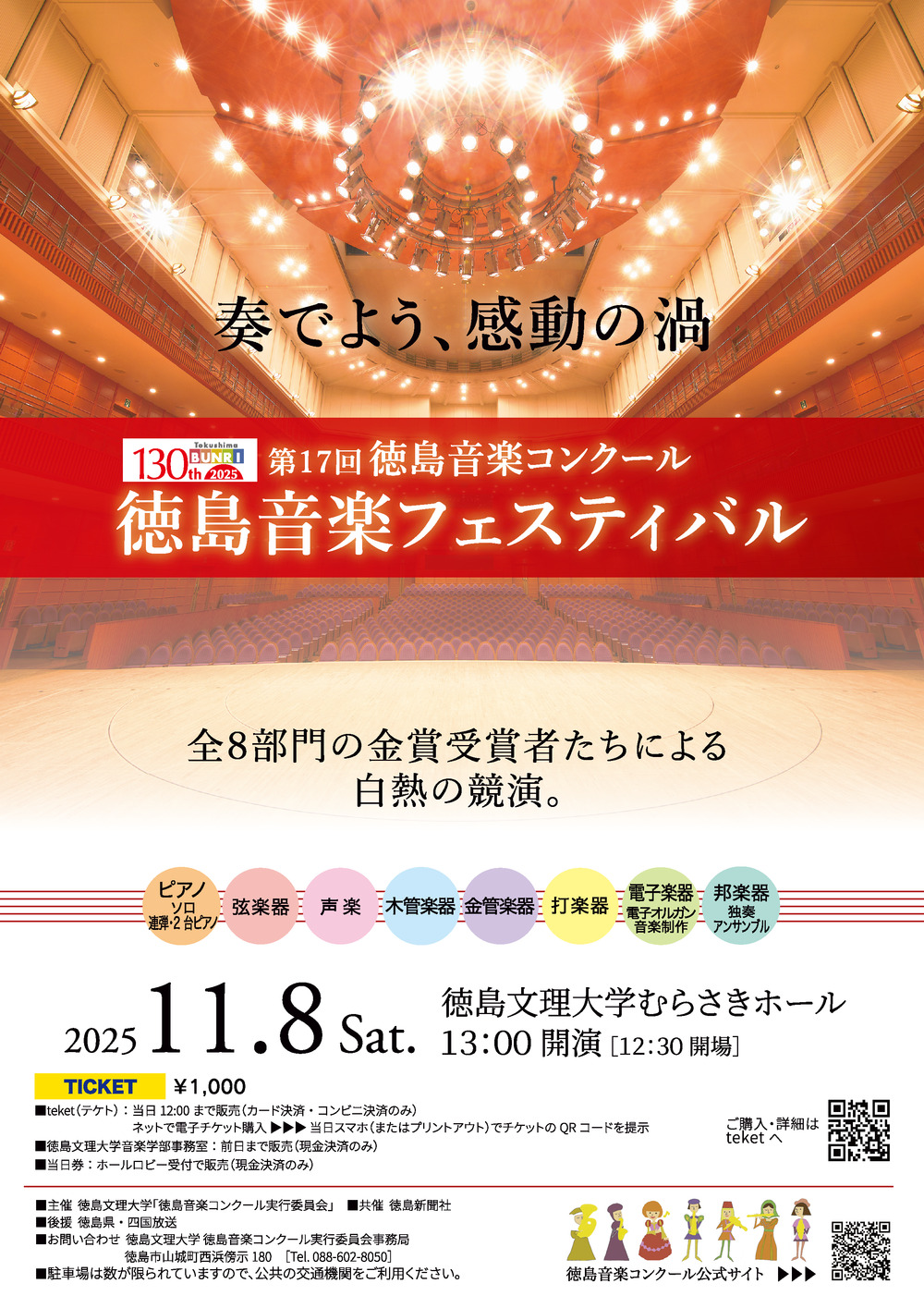 第17回徳島音楽コンクールの8部門、「ピアノ部門(ソロ/連弾・2台ピアノ)」「声楽部門」「弦楽器部門」「木管楽器部門」「金管楽器部門」「打楽器部門」「電子楽器部門(電子オルガン/音楽制作)」「邦楽器部門(独奏/アンサンブル)」の全金賞受賞者。