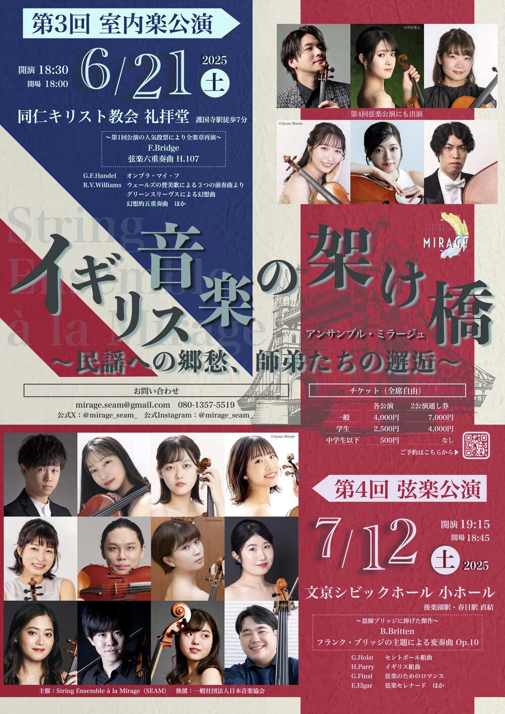 イギリス音楽を題材にしたひとつのテーマの元、室内楽公演と弦楽公演の2つのコンサートを開催します。2024 年5月に開催した第1回室内楽公演にて、お客様投票で人気1位となった F.ブリッジの弦楽六重奏曲の再演を出発点に、イギリス音楽を 「民謡」と「作曲家の師弟関係」 という2つの角度から紐解いていきます。