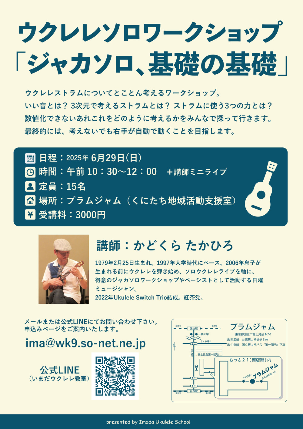 ウクレレストラムについてとことん考えるワークショップ。いい音とは?3次元で考えるストラムとは?ストラムに使う3つの力とは?などなど、数値化できないあれこれをどのように考えるかをみんなで探って行きます。最終的には、考えないでも右手が自動で動くことを目指します。