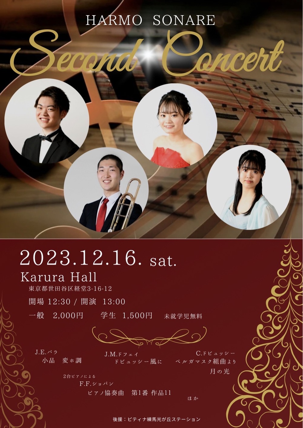 都立総合芸術高校10期卒業生で結成した私たちハルモソナーレのセカンドコンサートです。今回は、トロンボーンの吉澤大志、ピアノの杉原梨心、平山つらら、山口優葵でのコンサートとなります。