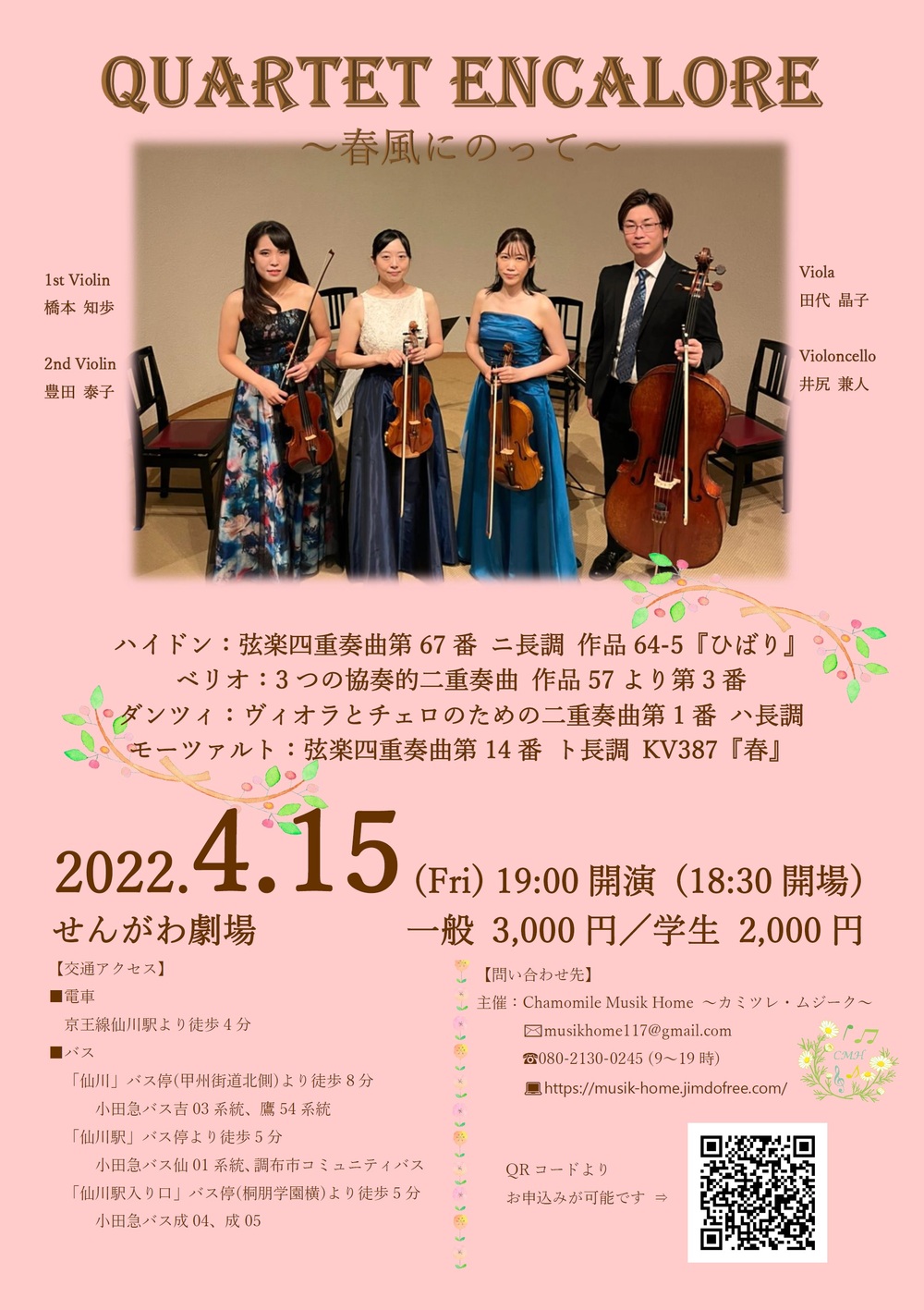 春をテーマに選曲した四重奏から、前回とはペアを入れ替えてのデュオなど、リピーターの方も初めての方も楽しめるプログラムとなっています♪