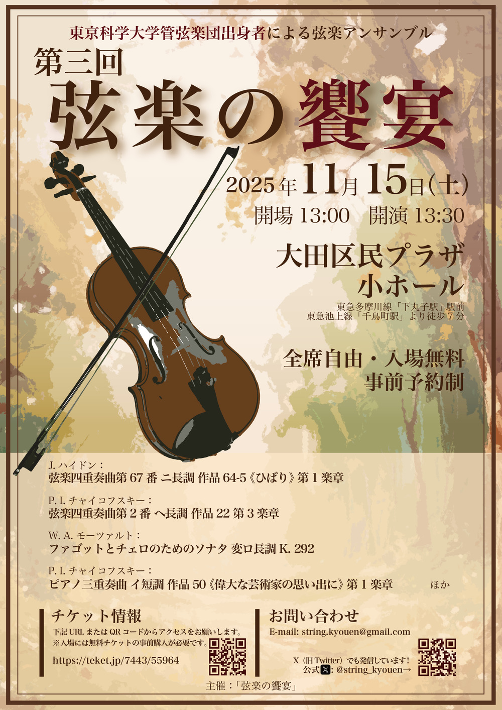東京科学大学管弦楽団の現役メンバーおよび出身者の有志による、弦楽アンサンブル演奏会です。王道の弦楽四重奏から4つのコントラバスによる重厚な演奏、管楽器やピアノの加わった華やかなアンサンブルまで、さまざまな響きをお楽しみいただける演奏会となっています。