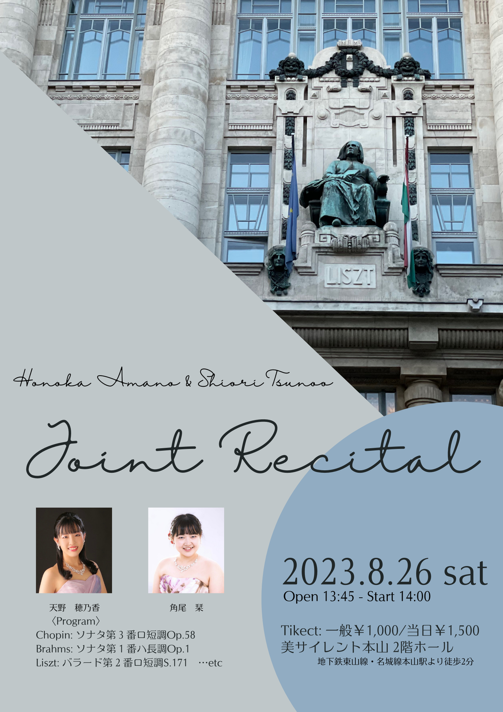 この度私たちはジョイントリサイタルをすることになりました! 同郷同い年の私たちは、昨年度ハンガリーにあるリスト音楽院留学で出会いました。 リスト音楽院で共に…