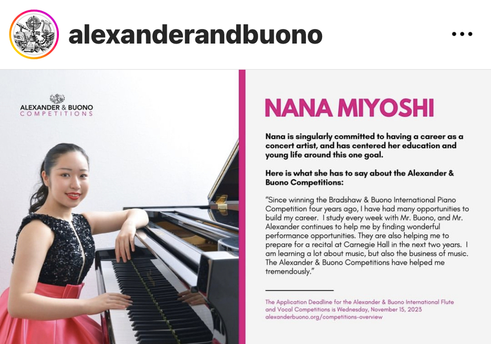 11歳でウィーンとニューヨークの国際ピアノコンクールで優勝し、翌年、カーネギーホールデビューも果たした実力派若手ピアニスト。2023年春にはカーネギーホールの公式イベント「Women in Music」にも参加し、スタインウェイホールやハンプトンズなどマンハッタンを中心に多くの公演を行いました。