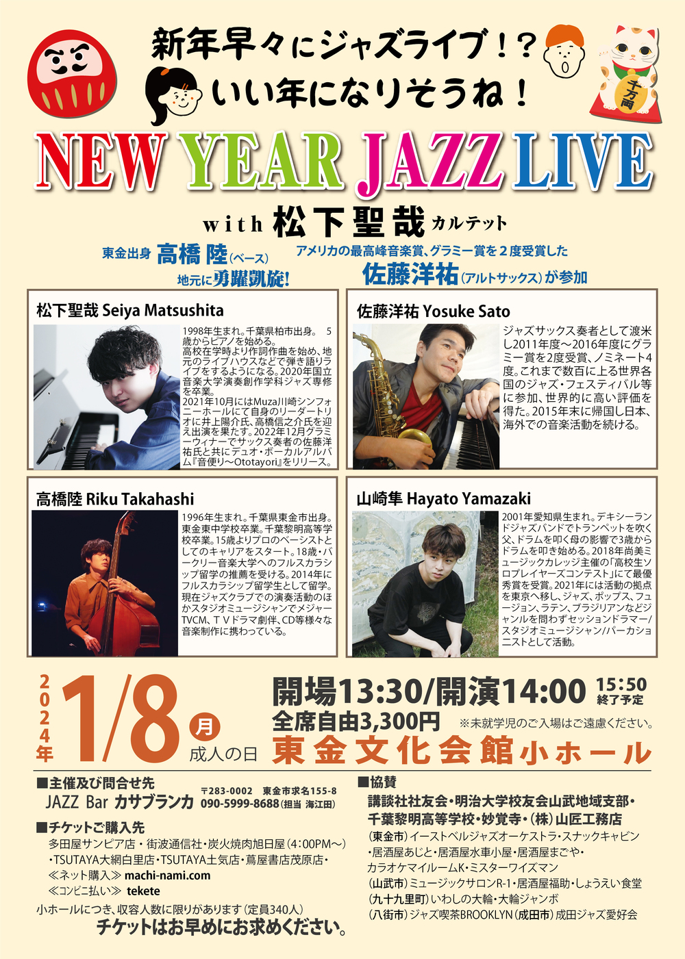地元東金出身の高橋陸(ベース)が地元に勇躍凱旋! グラミー賞を2度受賞した佐藤洋祐(アルトサックス)が参加!