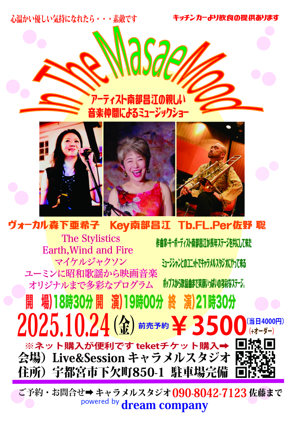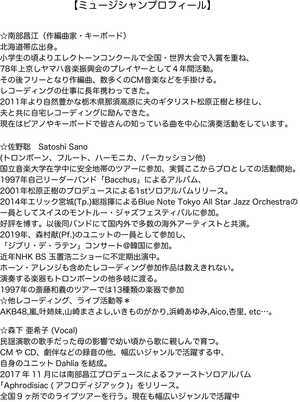 作曲家でもあるキーボーディスト南部昌江が織りなすグッドなサウンドをヴォーカル森下亜希子とトロンボーン・フルート・パーカッション名手佐野 悟が盛り上げます。