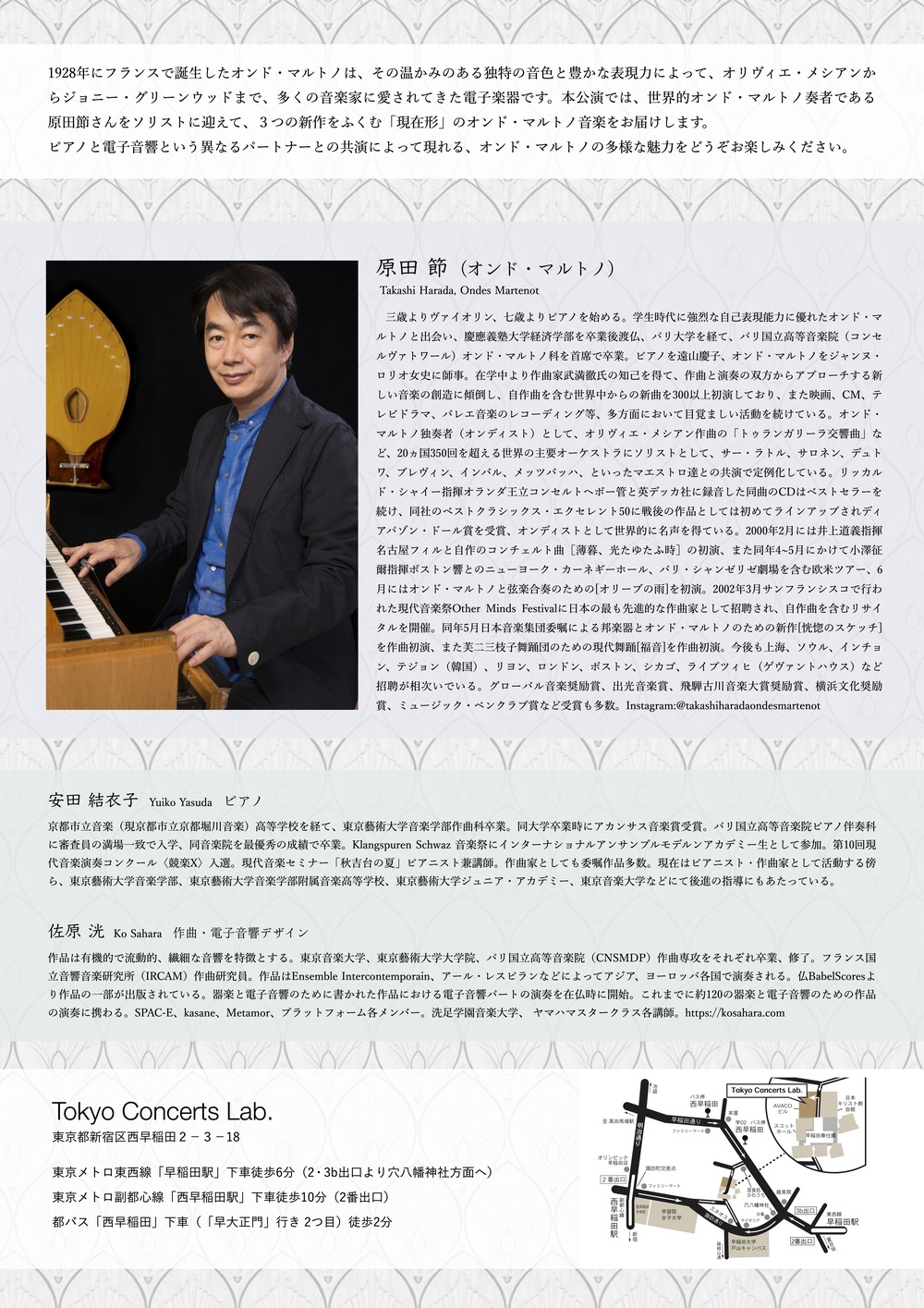 1928年にフランスで誕生したオンド・マルトノは、その温かみのある独特の音色と豊かな表現力によって、オリヴィエ・メシアンからジョニー・グリーンウッドまで、多くの音楽家に愛されてきた電子楽器です。本公演では、世界的オンド・マルトノ奏者である原田節さんをソリストに迎えて、3つの新作をふくむ「現在形」のオンド・マルトノ音楽を皆さまにお届けします。