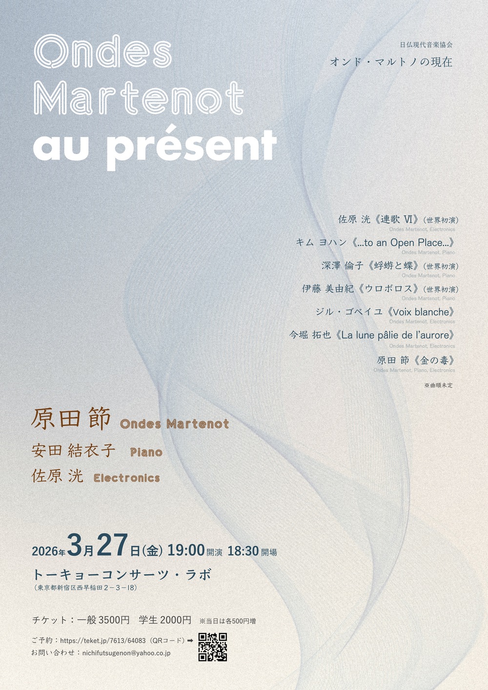 ピアノと電子音響という異なるパートナーとの共演によって現れる、オンド・マルトノの多様な表情をどうぞお楽しみください。