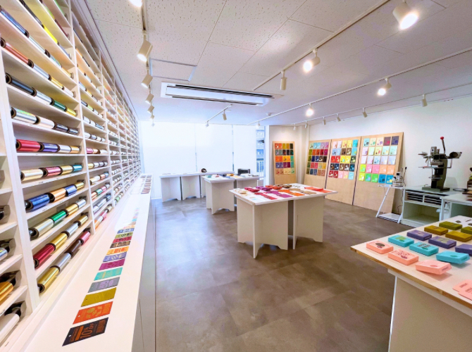 ▶手動箔押し機を使って、ズラリと並ぶ箔棚の中から好きな箔を選んで頂き、実際の箔押しを体験して頂けます